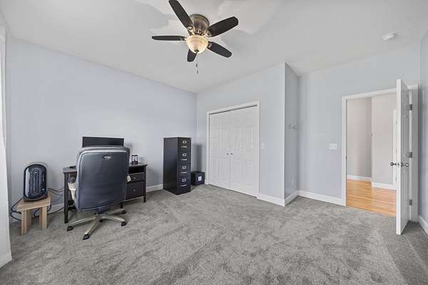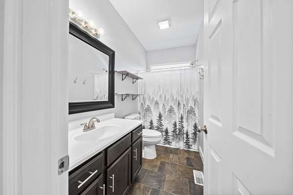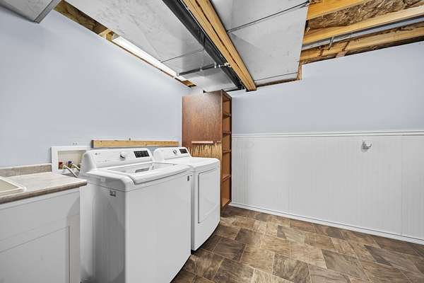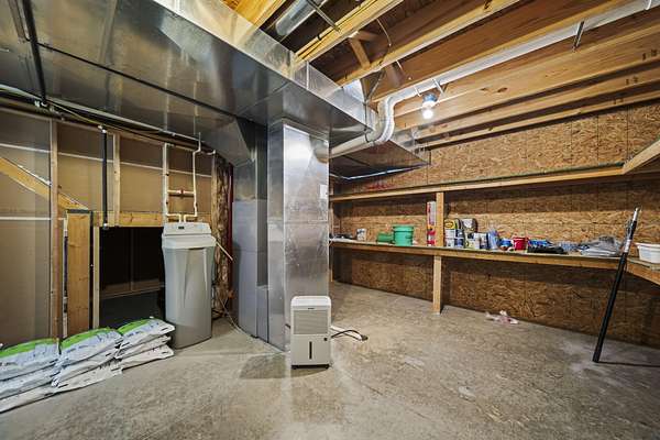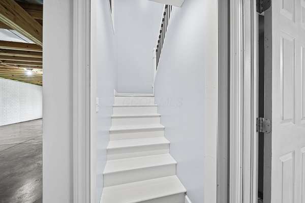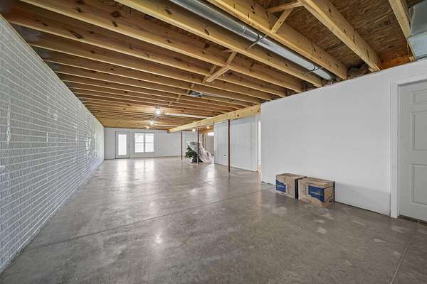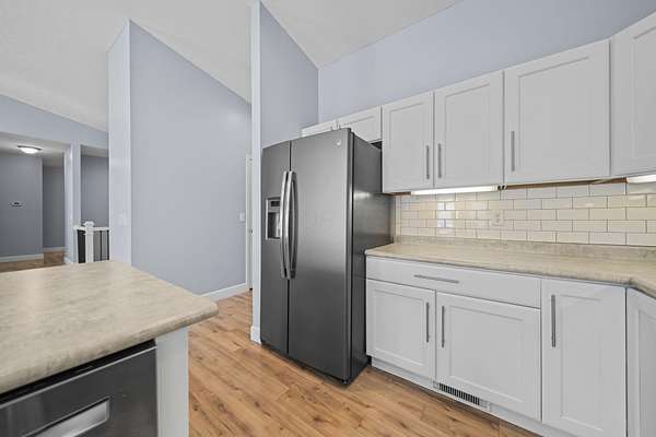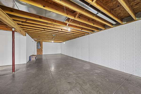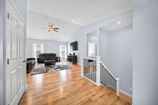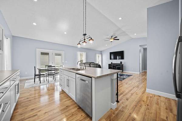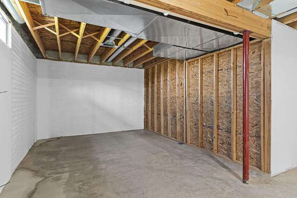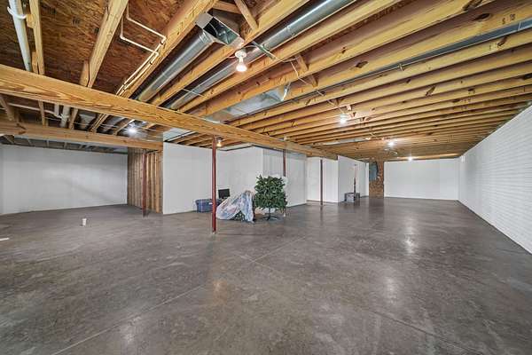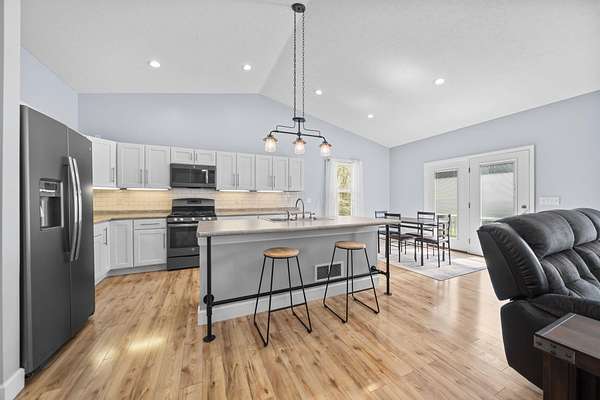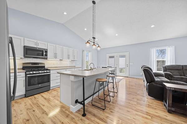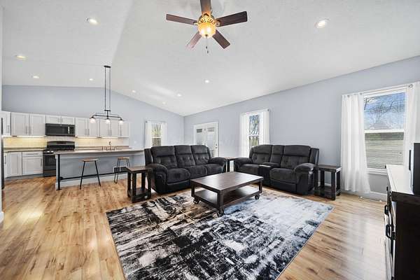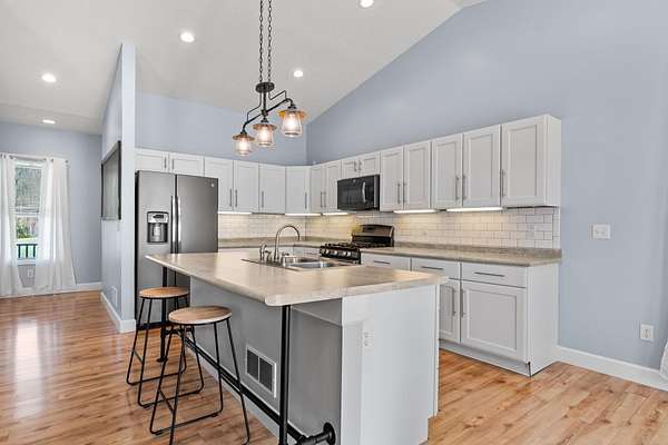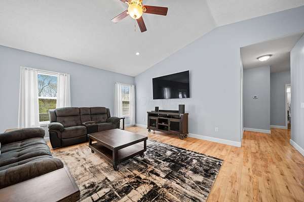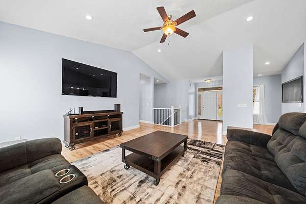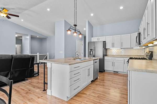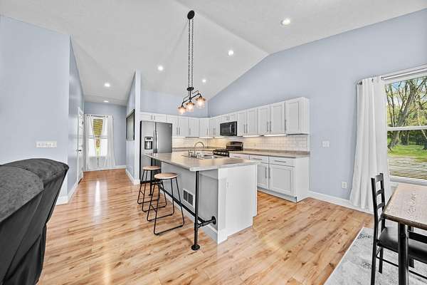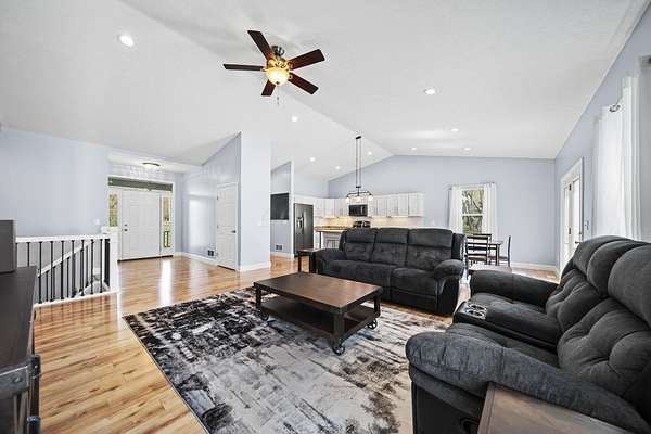 The home features three generously sized bedrooms and two and a half baths, with plumbing already in place for a third full bathroom in the lower level, offering excellent potential for future expansion. An open-concept floor plan is enhanced by cathedral ceilings and abundant natural light, creating an airy and inviting living space.