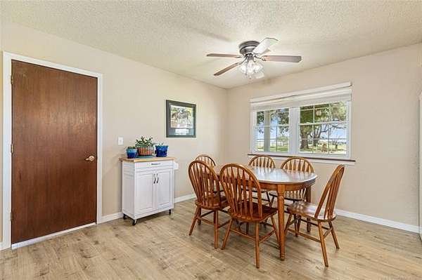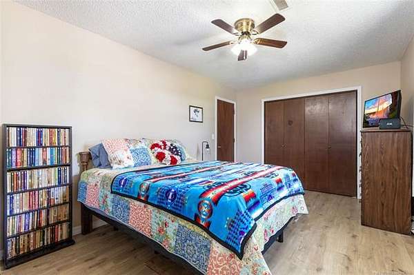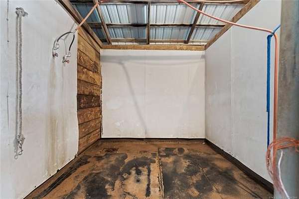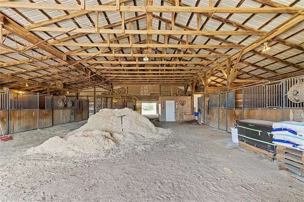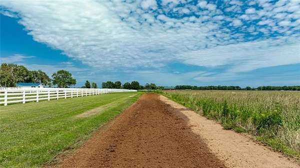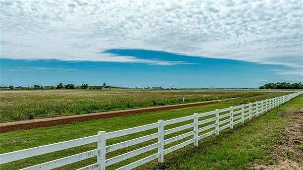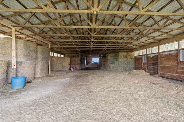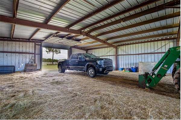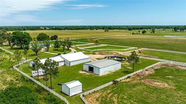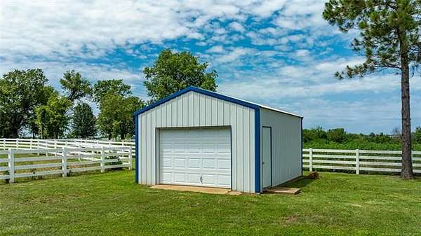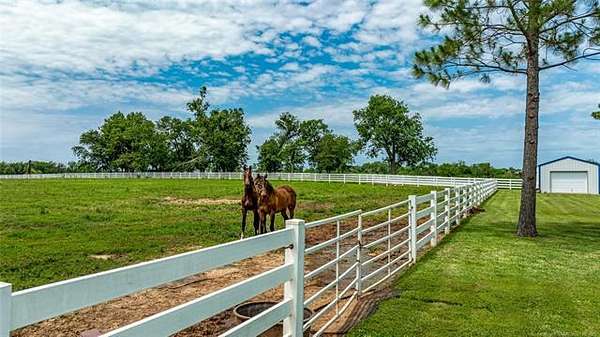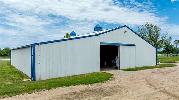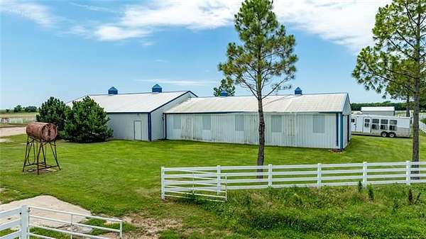 This ranch is currently operating as a racehorse training facility, complete with a 5/8-mile dirt track. Over two miles of striking white vinyl fencing create a picturesque setting that catches the eyes of travelers along the nearby Will Rogers Turnpike. The main barn (60'x60') includes eight stalls, a wash rack, a tack room, and a spacious riding area in the center. Attached to this barn is a 36'x60' extension, which could be transformed into additional stalls, hay storage, or even an indoor riding space.