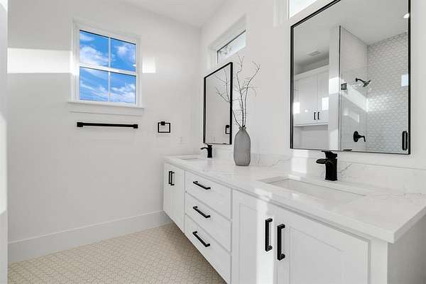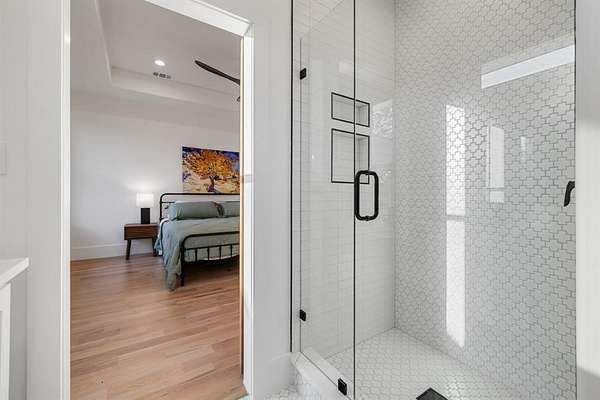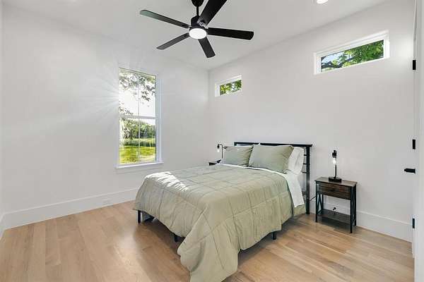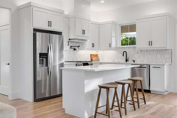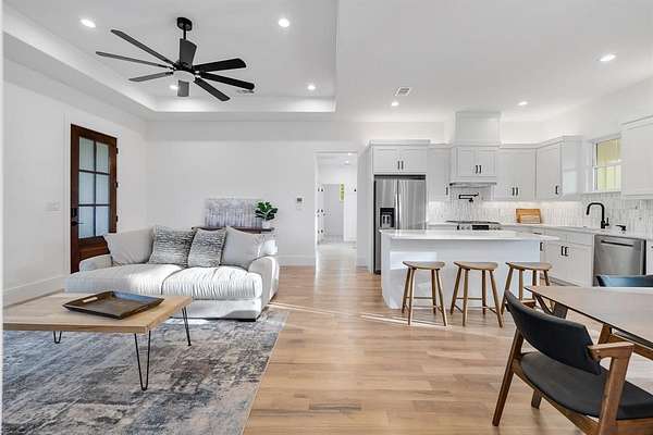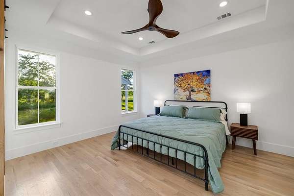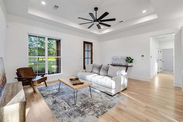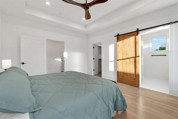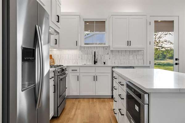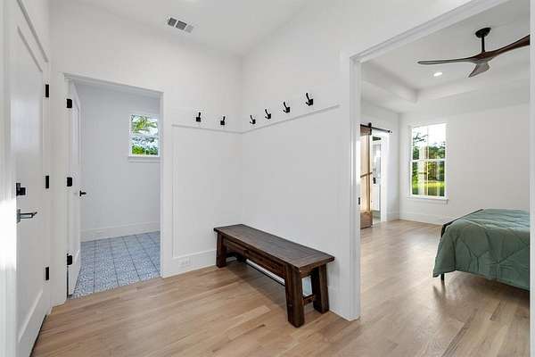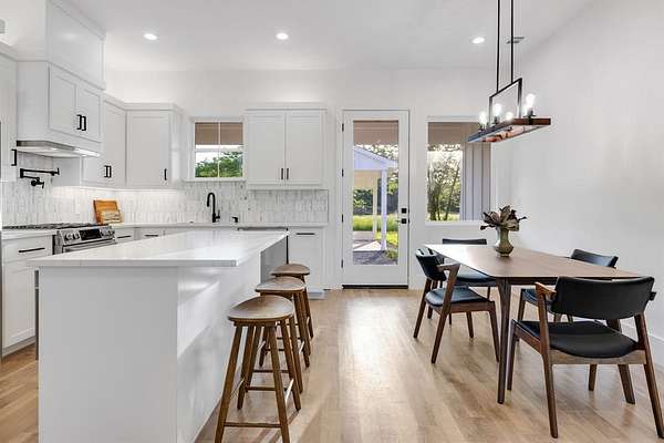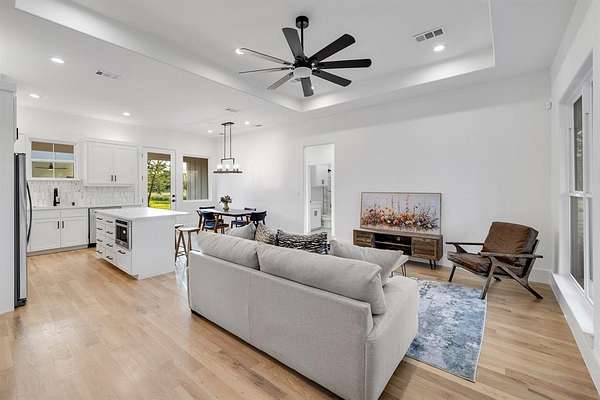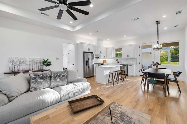 Step inside to a bright, open-concept layout that seamlessly blends modern design with rustic warmth. The spacious living, dining, and kitchen areas flow together under high ceilings and are accented with real white oak hardwood floors, custom cabinetry, and quartz countertops. The layout is perfect for entertaining or simply enjoying the openness of country living.
