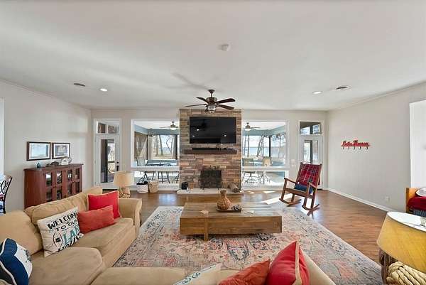 Welcome to paradise on Lake Tawakoni! This one of a kind gated waterfront estate is ideally located just outside city limits, meaning no city taxes and tucked away at the end of a quiet cul-de-sac. The property offers exceptional space and privacy with 0.34 acres owned plus approximately 2 additional acres leased from the Sabine River Authority, creating an expansive setting perfect for entertaining and relaxation. The main residence features hardwood floors, a spacious living area with a stunning fireplace, and expansive windows that showcase breathtaking lake views. The home includes two primary bedrooms with ensuite bathrooms, plus a third bedroom with convenient access to a full bath just steps away. A separate three car garage includes a fully equipped guest suite above, complete with a kitchen and full bathroom. Ideal for guests or additional rental income. An additional one car garage located by the home , great for storing your kayaks, fishing gear and lawn equipment. Outdoor living is unmatched with a deck featuring a built-in grill, hot tub, screened-in sunroom and fire pit in the patio , all designed to capture endless lake views. The impressive metal dock offers two boat slips, two jet ski slips, and swim ladders, making lake life effortless and enjoyable. Home is fully furnished and move in ready, offering a seamless transition for buyers interested in continuing the short term rental operation. Buyer and buyers agent to verify all information, including schools, utilities, measurements and restrictions.