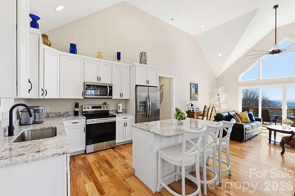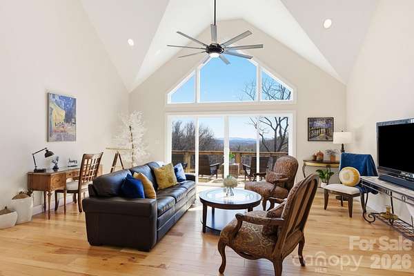 Stunning, year-round mountain views await at this well-maintained, 2023-built home on 5.03 private acres. Ideal as a mountain getaway or full-time residence (currently operating as an Airbnb), with furnishings negotiable for a truly turnkey opportunity. Bright, open floor plan with vaulted ceilings, beautiful hardwood floors, and an abundance of windows. Double doors open to a spacious, south-facing back deck that captures both sunrise and sunset light. Kitchen features a granite eat-in island, stainless steel appliances, and an electric oven/range. Primary suite offers deck access, a walk-in closet, and a tiled, walk-in shower. Unrestricted acreage provides wooded privacy and potential additional build sites (buyer to verify). Two-car parking pad and low-maintenance landscaping.