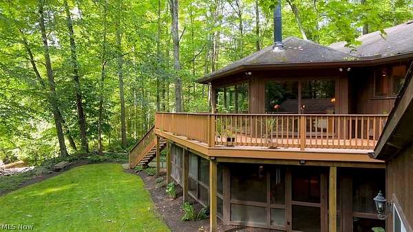 If Colorado ever claimed a spring retreat in Ohio, this would be it. Set on just over five wooded acres along storybook Griswold Creek, the entire property comes alive this time of year. Fresh greens start to push through the forest floor, sunlight filters a little longer each evening, and the sound of the creek becomes the constant backdrop-steady, calming, and quietly energizing. The landscape feels like it's waking up alongside you. Trees begin to leaf out, wildlife returns in rhythm, and every day brings a subtle shift-something new to notice, something just starting to bloom. Inside, the home unfolds across more than 6,000 total finished square feet with a ranch-style layout that lives beautifully on one level, plus a fully finished walkout lower level with in-law suite-ideal any of your extended stay needs. The 1st floorl includes the primary suite with water views, a dedicated office, 1st floor laundry, and 2 guest bedrooms that share a full bath-offering everyday functionality without sacrificing flow. Vaulted ceilings crown the great room, where one of the home's most striking architectural features takes center stage-the open-sided fireplace surrounded by walls of glass. It's equal parts sculpture and gathering place, framing views of the wraparound deck, towering trees, and the creek beyond. A wraparound main-level deck and lower-level screened porch invite year-round outdoor living, from snowy mornings with coffee to summer evenings lit by fireflies flickering in the trees that surround you. With some major updates already done: (new roof '25, a new Kinetico water system '25, and 2 new hot water tanks '25), you can simply enjoy the setting and decide, at your own pace, how to make it yours. This is a home with rock-solid construction, thoughtful proportions, and a layout and location that's increasingly hard to find. Live comfortably as-is and enjoy its retro character, or reimagine it with a modern vision to match the million-dollar estates around it.