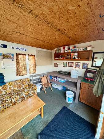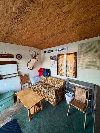 A small camp is located just steps from the pond’s dock, providing an ideal spot for weekend stays or a warm retreat during long, cold November hunts. A nearby utility shed offers convenient storage for tools, equipment, and recreational gear used on the property. The land is fully enclosed with an above-average five-wire barbed fence.