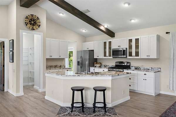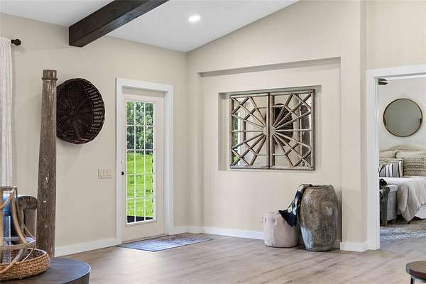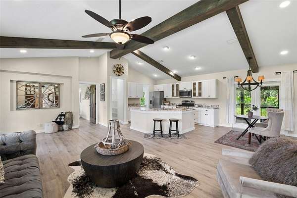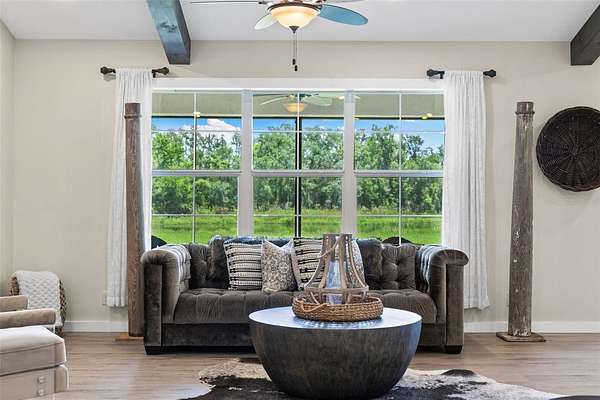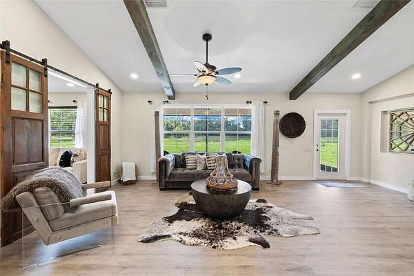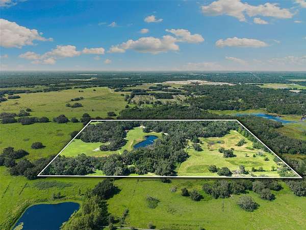 Discover a once-in-a-lifetime opportunity to own 50 ACRES in Spring Hill, just a few miles north of 52. As you arrive, canopy trees line your picture-perfect drive, welcoming you into a peaceful sanctuary. AC ZONING allows for farming and multiple INCOME PRODUCING OPPORTUNITIES -- RARE FIND! The 2015 single-family residence has been tastefully upgraded with fresh paint, new flooring, and decorative wooden beams throughout. From the screened front porch, enjoy serene views of your private pond--an ideal spot to sip your morning coffee while listening to the quiet hum of nature. Inside, soaring ceilings, abundant natural light, and PANORAMIC VIEWS create a warm and inviting atmosphere. The kitchen features stainless steel appliances, crisp white cabinetry, a walk-in pantry, and granite countertops, all overlooking the living room--perfect for entertaining. Additional upgrades include a reverse osmosis system and tankless water heater for comfort and peace of mind. The primary suite offers generous space, beautiful views, and a luxurious shower with decorative tile. Behind newly added barn doors, you'll find a flexible room--ideal as an office, bonus space, or additional bedroom. The third bedroom includes a spacious walk-in closet and overlooks the treed backyard, while the second bathroom has been updated with a new vanity and decorative tile. THE LAND IS TRULY ONE OF A KIND. With open pastures, it's ready for horses, cattle, or any vision you imagine. An enclosed workshop with garage space, along with a large pole barn overhang, provides ample room for equipment, storage, and hobbies. The property's perimeter is fully fenced, offering both security and functionality, and a built-in trail system allows for horseback riding along the boundaries of the property. Whether you're dreaming of a FAMILY COMPOUND OR PRIVATE RETREAT, this property provides ENDLESS POSSIBILITIES. Nestled in with NO HOA, you'll enjoy COMPLETE PRIVACY while remaining just minutes from grocery stores and a short drive to Tampa. This is a property that must be experienced in person to truly appreciate its beauty and potential.