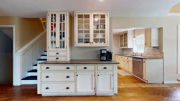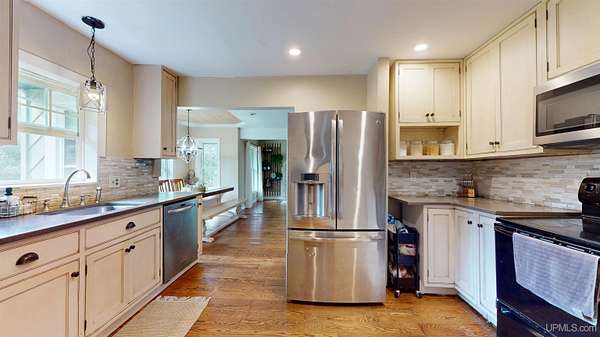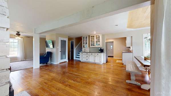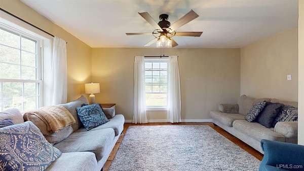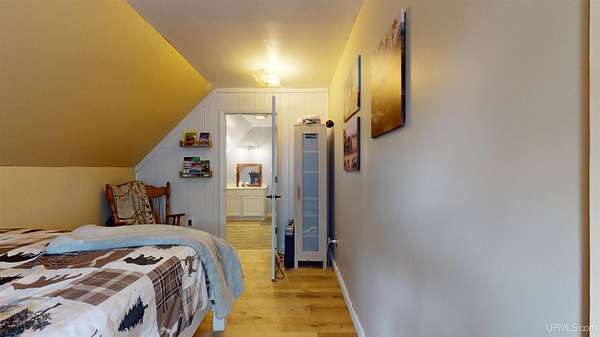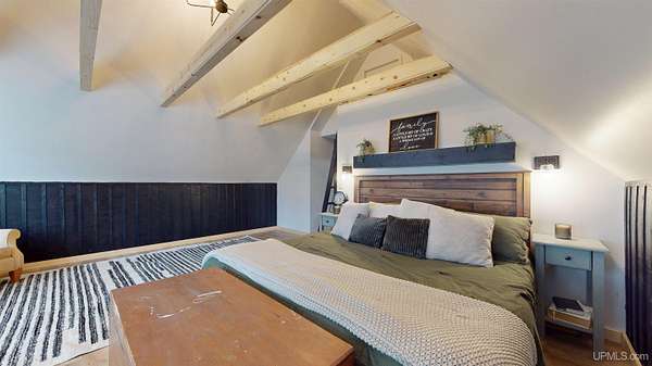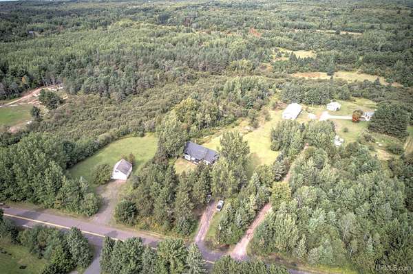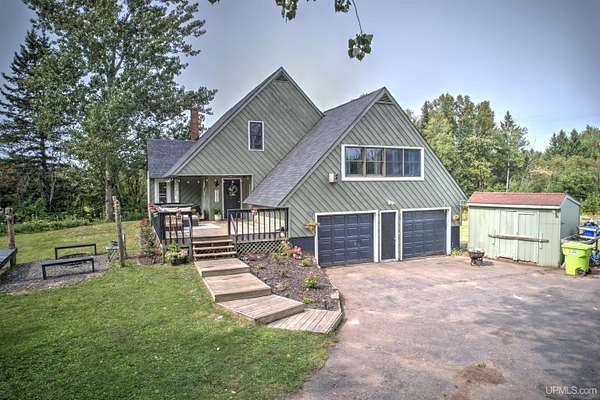 Set on four wooded acres in Stanton Township, this chalet-style home offers space, privacy, and character just minutes from Houghton. The property stretches back along Schlot Creek, with a mix of rolling terrain, trees, and open yard space, making it an appealing setting for both everyday living and recreation. Inside, the home spans over 2,200 finished square feet with an additional full unfinished basement. The main floor centers around a warm and inviting living room with wide plank hardwood flooring and a wood-burning fireplace, open to a formal dining area and a bright kitchen. A full bathroom with double sinks and mudroom entry are also on this level. Upstairs, four well-sized bedrooms and a second full bathroom provide plenty of room for family or guests. The primary bedroom measures an impressive 18x19 feet and includes a walk-in closet (and extra space for an en-suite bathroom). Each bedroom has its own character, one of which has a nook area ideal for a reading or play space. The basement is ready for storage, a workshop, or future living space with high ceilings. Utilities include propane boiler heat with radiant floors on the main level and baseboard on the 2nd level, wood hot water supplemental heating (wood boiler in the garage), and fiber internet (ideal for working from home). Outside, a large yard, a deck, and a patio create an inviting exterior. The attached two-car garage and a paved driveway adds practicality. Schlot Creek runs through the property, giving a peaceful natural backdrop right in your own yard. If you've been seeking a rural setting with room to spread out, yet still want to be just a short drive to town, this Stanton Township home is worth a look! Check out the 3-D Tour!