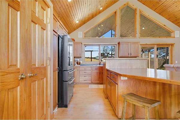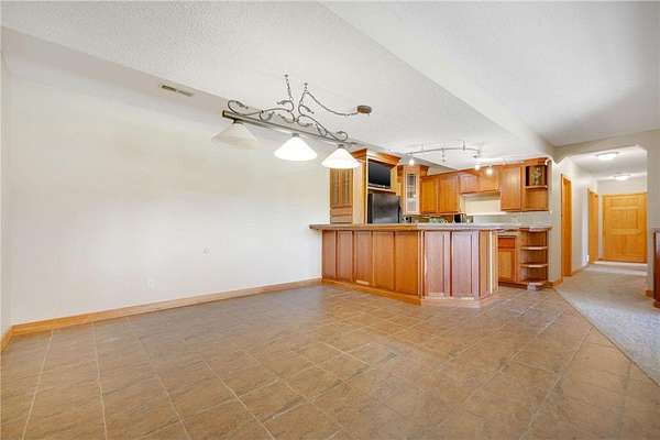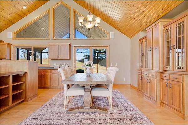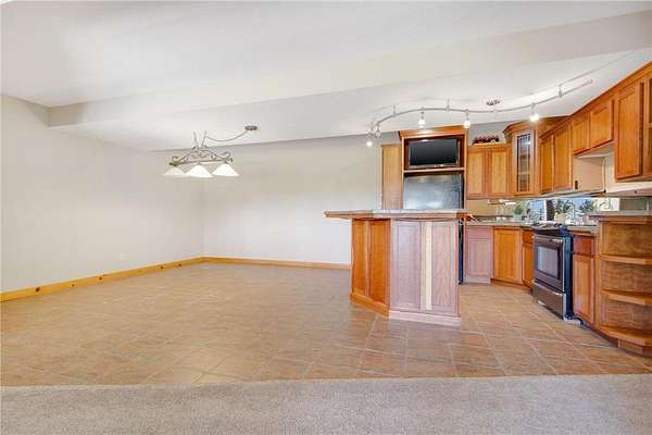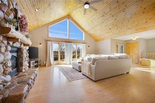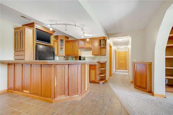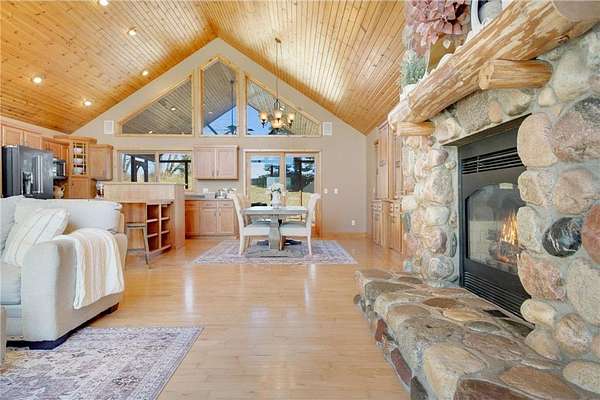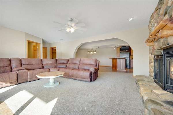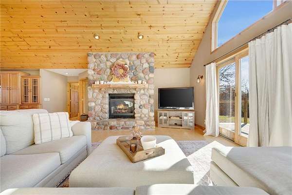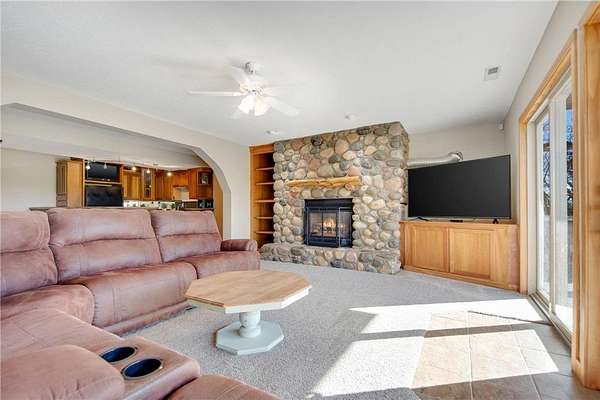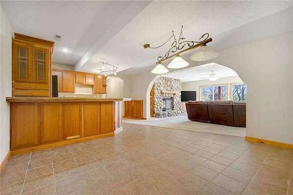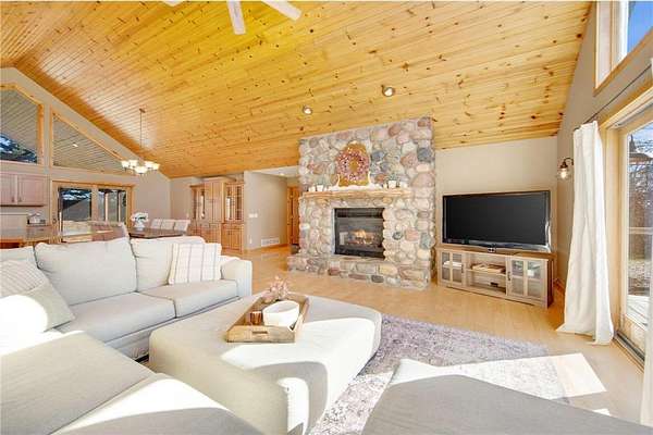 Welcome to this inviting one level living rambler with a fully finished basement. A vaulted ceiling creates a dramatic entry and an open concept filled with natural light. The main level features hardwood floors, recessed lighting, a bright three season porch, cherry cabinets, a generous main floor laundry, and a cozy fireplace.