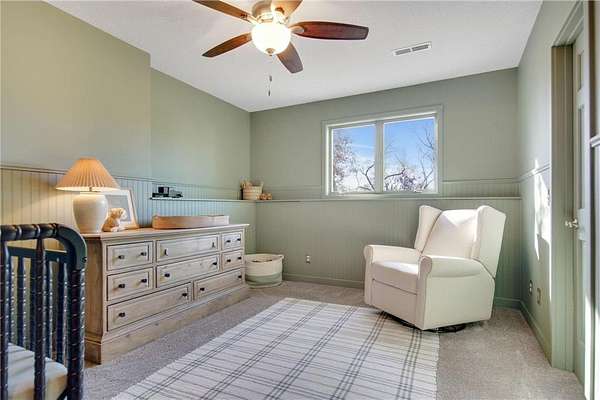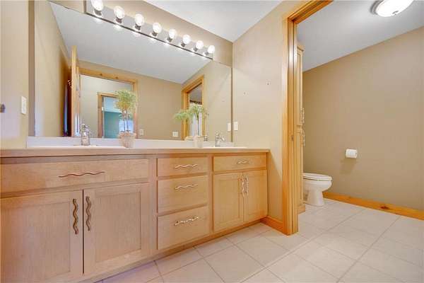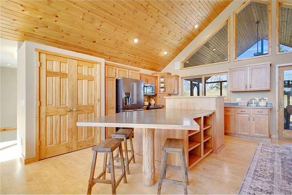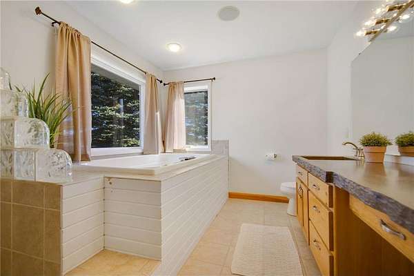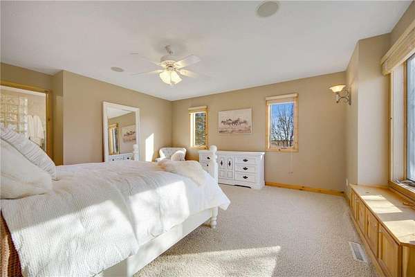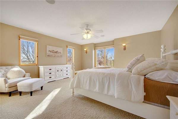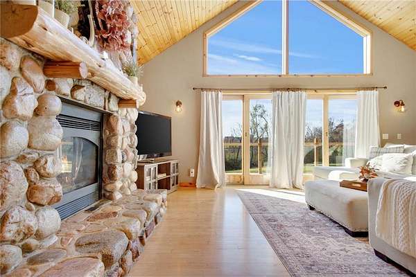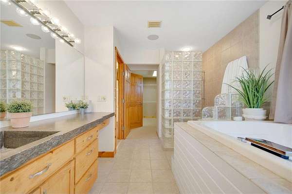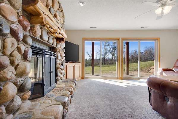 The primary bedroom suite is a true retreat with a glass block shower, large tub, walk in closet, and a sitting bench with storage. The lower level offers excellent flexibility for guests or extended living and includes a full separate kitchen, dining area, and a second fireplace for added comfort.