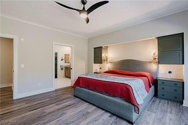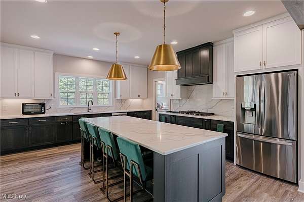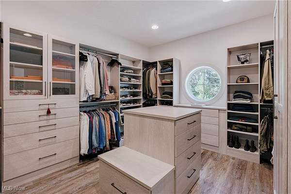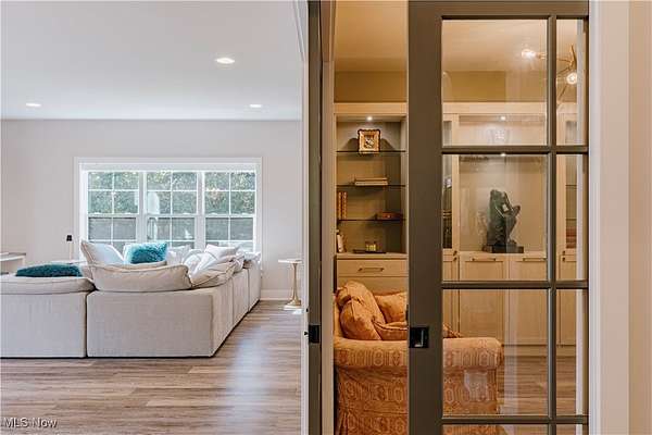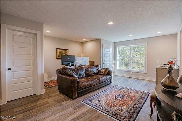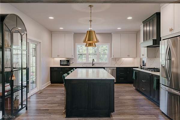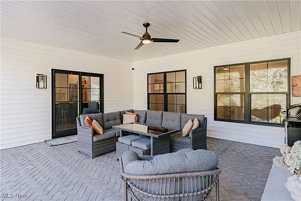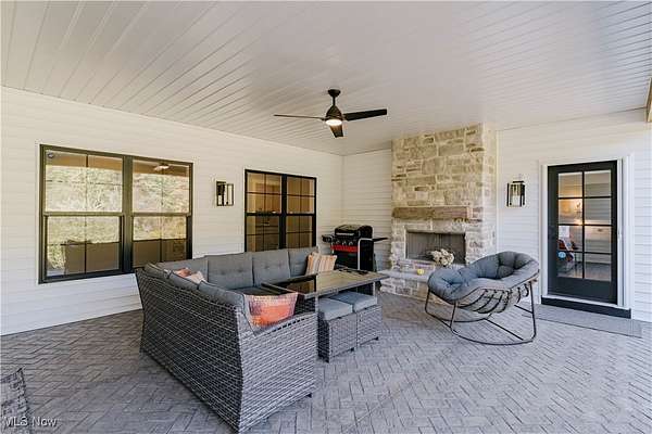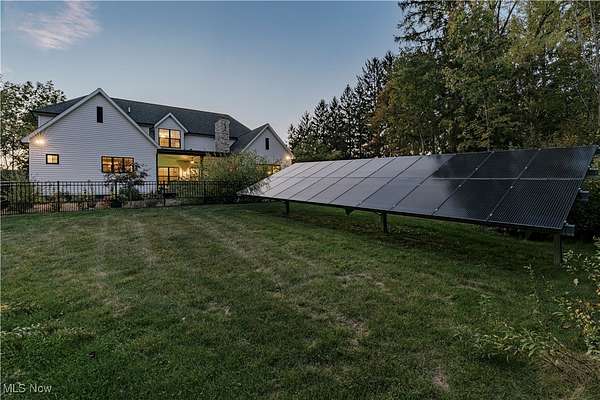 Welcome to this extraordinary residence, crafted by Old World Custom Builders, where modern functionality meets classic design on a private 5-acre setting. Every detail has been thoughtfully considered to combine elegance, comfort, and accessibility. Step inside from the charming front porch to a warm foyer that opens into a sunlit, open-concept living and dining space. Custom built-ins frame a fireplace with a striking quartz surround, while corner pocket doors lead to a refined office or library-perfect for a quiet retreat. The dining area connects to a chef's kitchen with a large center island, gleaming quartz counters, stainless appliances, and a generous scullery with second oven and microwave. Designed for ease of living, an elevator serves the lower, first, and second floors. The first-floor primary suite offers a spacious bedroom with custom built-ins and direct porch access. The ensuite bath includes a double vanity, curb-less shower, and a massive dressing room/walk-in closet. A stylish half bath, laundry, and mudroom with garage access complete the main floor. Upstairs, find three additional bedrooms, including a versatile suite with elevator access, ensuite bath, kitchenette with granite counters, and flexibility to serve as a private living space or office. The lower level expands the living area with a finished rec room, fifth bedroom with egress window, and full bath. A thoughtfully designed safe space provides both secure storage and a storm-ready retreat. Outdoor living is equally inviting: a covered back porch with cozy fireplace sets the stage for evenings under the stars. The fenced yard and perennial garden showcase old English roses, attracting butterflies and hummingbirds, while beyond the garden, a once-thriving orchard now offers untamed natural beauty. A 22-panel solar array with battery storage boosts efficiency and sustainability. This home isn't just a place to live-it's a masterpiece of thoughtful design, blending luxury and comfort.