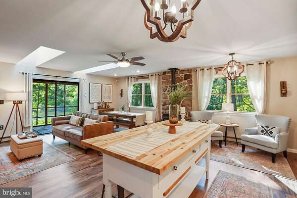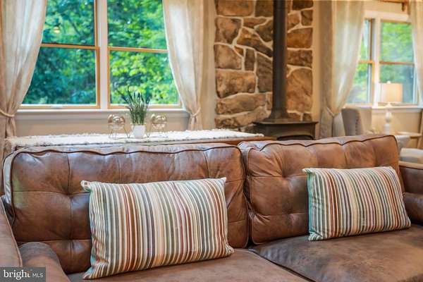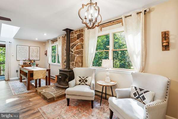 - Attic, Ceiling Fan(s), Dining Area, Open Floor Plan, Tub Shower Bathroom, Whirl Pool/Hot Tub, Window Treatments, Wood Stove