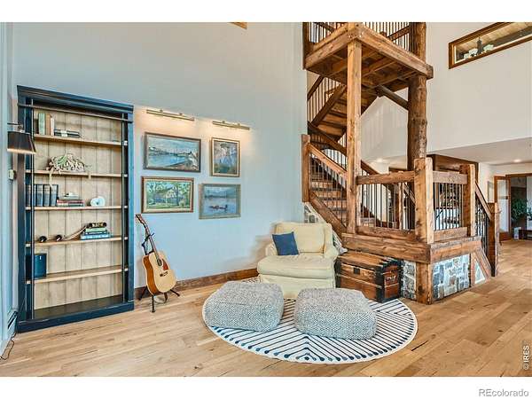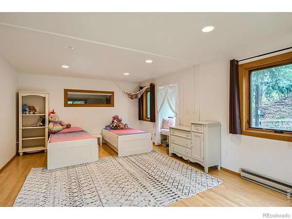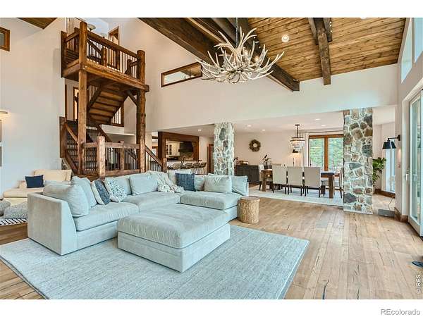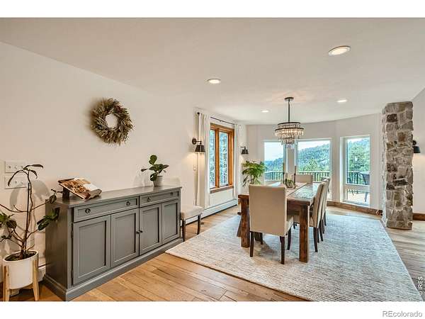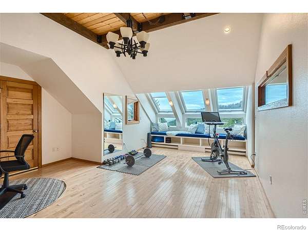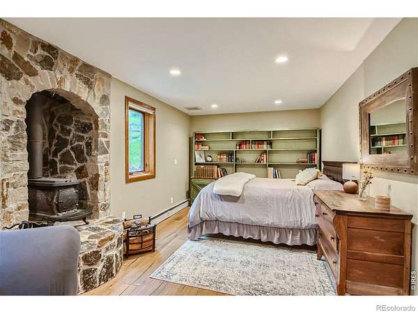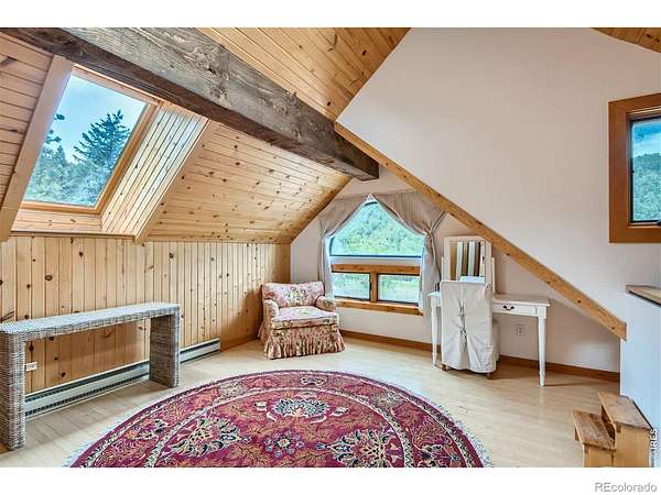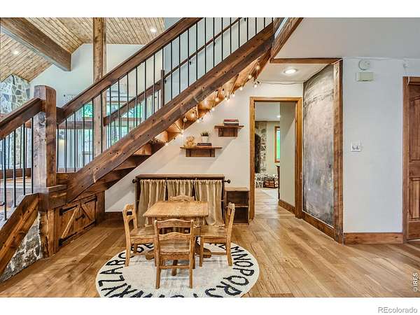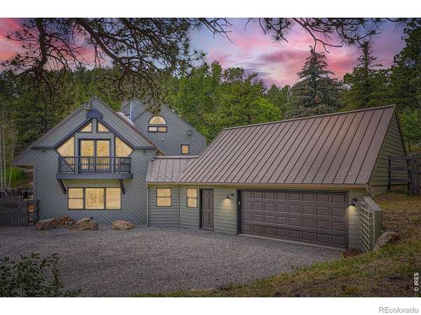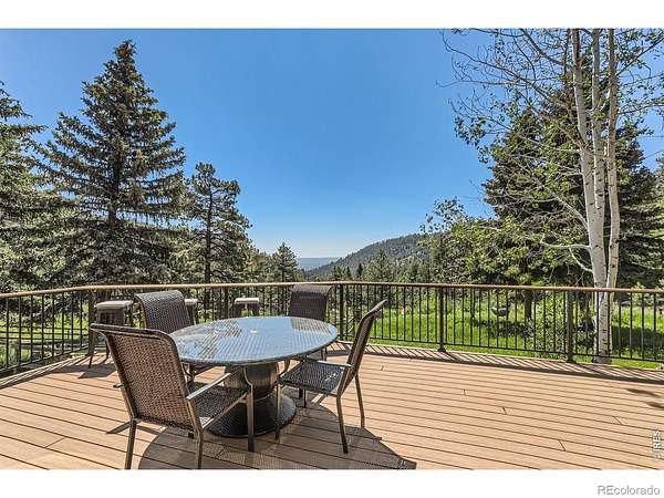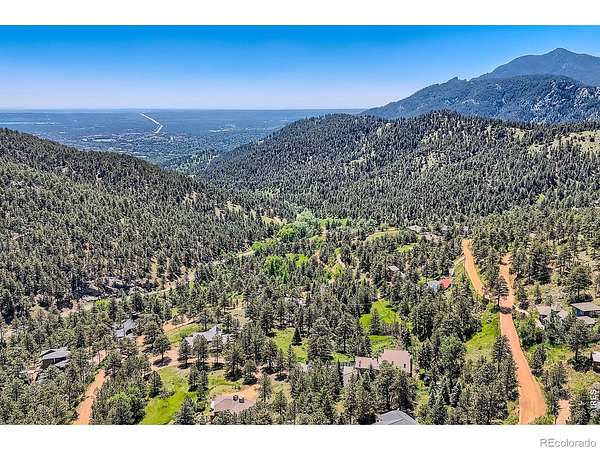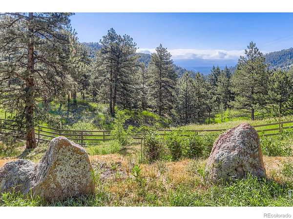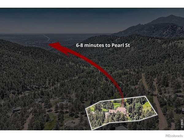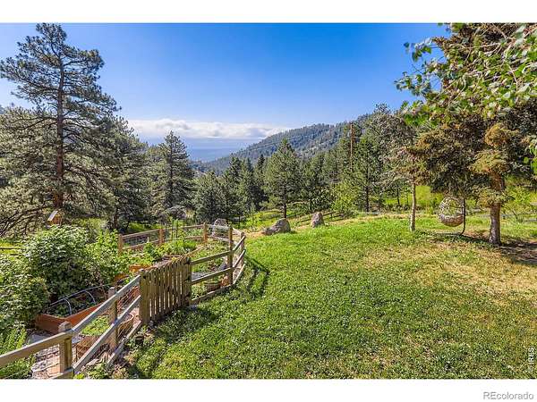 Beautifully renovated Sunshine Valley home, perfectly positioned on nearly two private acres just moments from Pearl Street Mall. Where elevated mountain living meets refined design: an exceptional five-bedroom home with a versatile bonus space, framed by sweeping views of Boulder and the plains below. Soaring, beamed ceilings and dramatic floor-to-ceiling windows anchor the great room, inviting natural light to pour in while capturing breathtaking vistas in every season. Rich wood and stone textures create a warm, alpine sophistication, blending timeless craftsmanship with an elevated aesthetic. The formal dining room, illuminated by a statement chandelier, sets the stage for unforgettable evenings against a backdrop of mountain skies. The eat-in kitchen is both functional and beautifully appointed, featuring a generous prep island, breakfast bar, and sunlit breakfast nook for effortless mornings and lively gatherings. A charming main-level bedroom with a wood-burning stove offers comfort and flexibility, ideal for guests or a private study. Ascend the handcrafted log staircase to a secluded upper-level retreat. The primary suite unfolds through a light-filled flex space, perfect for an office or wellness room, into serene sleeping quarters with dual closets, a wood-burning fireplace, and a Juliette balcony with stained glass overlooking a tranquil, tree-lined setting. The five-piece bath delivers spa-level indulgence with an oversized shower and soaking tub. Additional upper-level bedrooms include one with private deck access to the backyard sanctuary, while the top level offers a fifth bedroom plus a non-conforming sixth, ideal for guest quarters, creative space, or a studio. Outdoors, a fenced yard and flourishinggarden complement the natural landscape, creating a setting that feels both expansive and intimate. Just minutes from downtown Boulder's vibrant downtown, this rare offering delivers privacy, scale, and proximity-an extraordinary mountain estate.