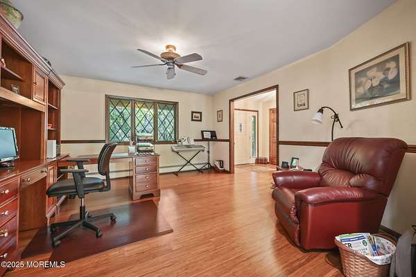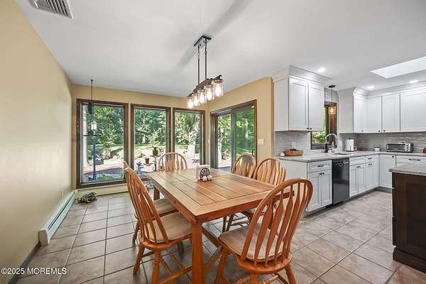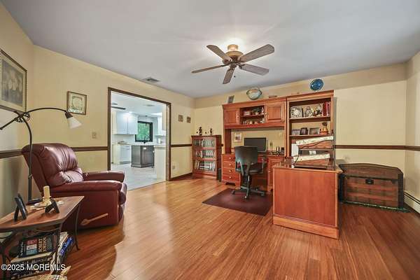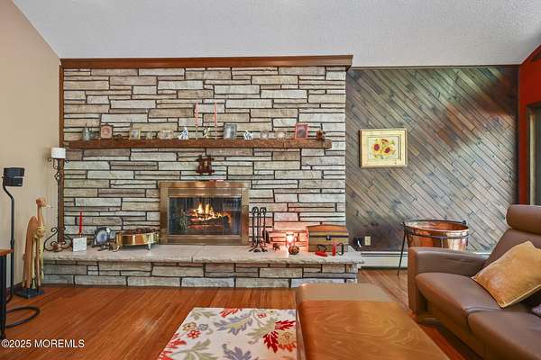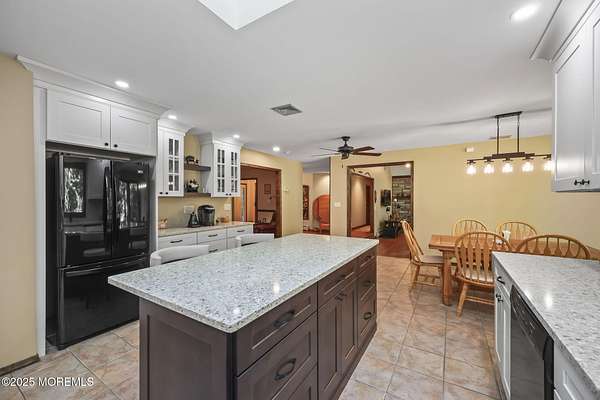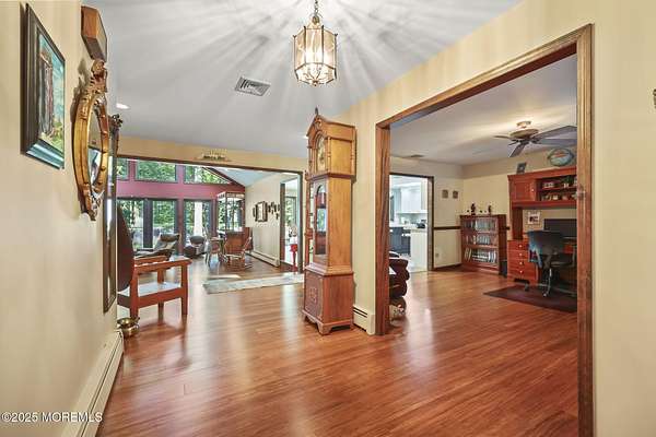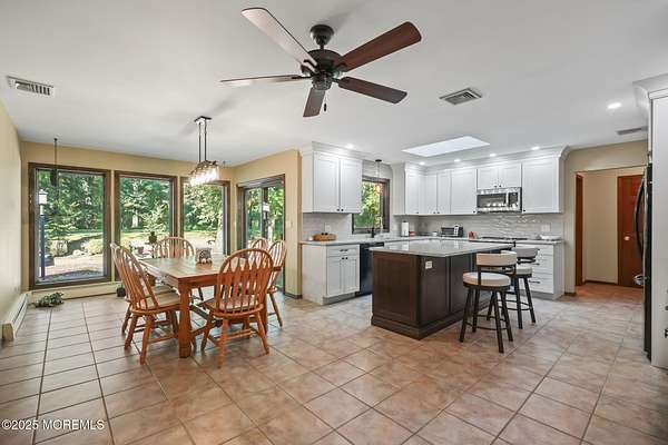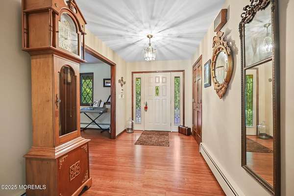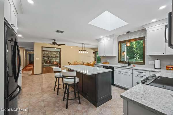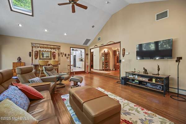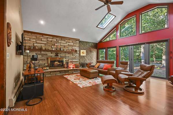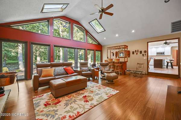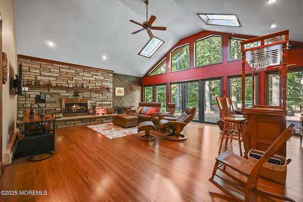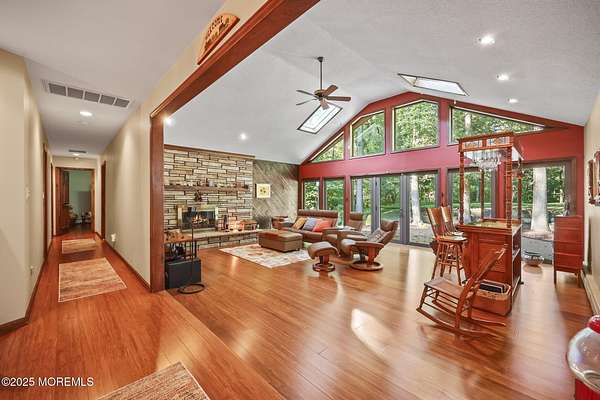 A rare opportunity to own this extraordinary ranch set on approximately 2.5 acres of true park-like property, offering privacy, tranquility, and an impressive lifestyle. With over 3000 square feet of living space, this sprawling residence blends modern comfort with a touch of California flair. Step through the inviting entryway and be captivated by the breathtaking step-down two-story Great Room featuring vaulted ceilings, skylights, and a dramatic full wall of floor-to-ceiling windows that flood the space with natural light. The centerpiece of the room is a stunning wood-burning fireplace with an elegant stone surround, creating the perfect setting for both everyday living and entertaining. The newer gourmet center-island kitchen is a chef's dream, boasting custom white wood cabinetry with crown moldings, a custom tile backsplash, sleek quartz countertops, and a spacious 13'x11' eat-in area ideal for gatherings. The formal dining room, currently being used as an office, provides versatility for today's lifestyle. Throughout most of the home, you will find beautiful bamboo hardwood flooring, with the kitchen showcasing ceramic tile. The primary suite offers the perfect retreat with an 18'x17' bedroom, separate dressing area, walk-in closet, and a private full bath featuring a stall shower. Two additional generously sized bedrooms share an updated main bath complete with custom tile work, a tub-shower combo with frameless glass door, and a rich wood vanity. Additional highlights include central vacuum, recessed lighting, baseboard heating, a large custom TimberTech deck ideal for outdoor entertaining, natural gas hook-up available for approximately $350, and a circular driveway with plenty of parking. There is also additional exterior storage space conveniently located on the side of the home. This property offers the unique combination of expansive acreage, refined interior details, and modern amenities, making it a true one-of-a-kind offering. With endless possibilities both indoors and out, this home must be seen in person to truly be appreciated.