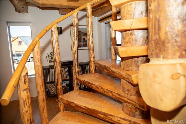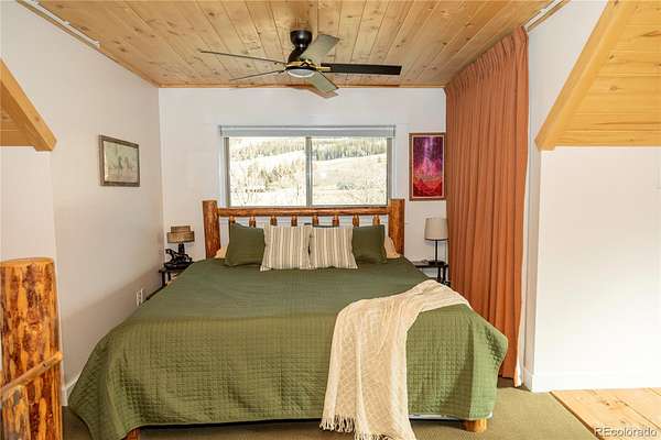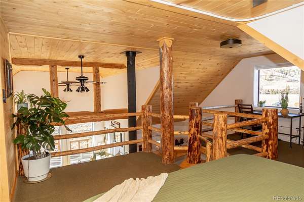 The cabin has been immaculately kept and recently updated, featuring fresh interior paint, new windows, new appliances, and exterior chinking and sealing. The large windows fill the great room with natural light. The great room boasts vaulted ceilings and large windows to enjoy the views. The living room opens to the kitchen with its new appliances, custom tiley aspen cabinets, sleek black granite counters, and a private dining nook. The mainfloor bathroom is large and includes laundry and additional storage. A small guest bedroom/ office completes the first floor. The loft primary suite is accessed via a beautiful skip peeled log spiral staircase. The primary suite is spacious and includes an ensuite bath with a large soaking tub.