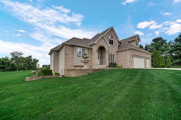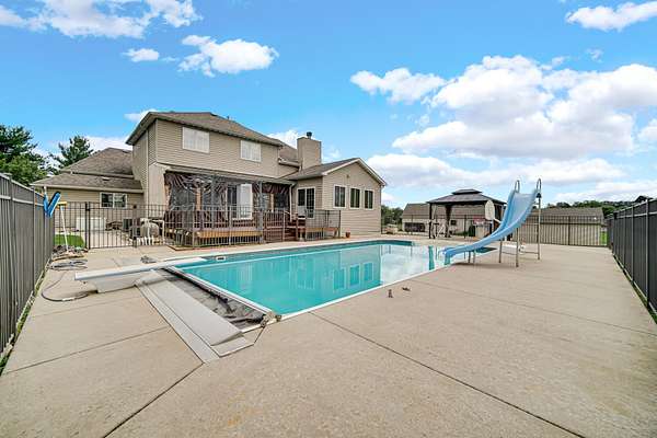 Welcome to Timber Point and this impressive hillside 2-story home nestled on 2 scenic acres in the sought-after southwest side of Valparaiso. Set at the end of a quiet cul-de-sac, this property offers peaceful privacy with sweeping views of rolling meadows and a shared manicured pond complete with a fountain and park-like setting. Designed for comfort and entertaining, the backyard oasis showcases a 20x40 heated inground pool with auto-safety cover, expansive patio and deck space, plus a screened-in back porch--perfect for enjoying gorgeous west-facing sunsets over the Indiana countryside. Step inside to a thoughtfully designed open concept floor plan featuring a kitchen, dining, and great room with soaring ceilings and a double-sided fireplace. A light-filled sunroom overlooks the pool, while the formal dining room adds a touch of elegance for gatherings. The main floor primary suite offers a spacious ensuite bath and walk-in closet, while the upper level hosts 3 additional bedrooms and a full bath. The finished daylight and walk-out basement provides endless versatility with related living or guest accommodations, including a 5th bedroom with private bath and closet. Entertain with ease at the large bar and 2nd kitchen, or relax in the abundant open space. Additional highlights include a 3-car garage, 4 total baths, whole house generator, and multiple outdoor living spaces designed for year-round enjoyment. Conveniently located near award-winning Valparaiso schools, commuter-friendly routes, and just a short drive to both Valparaiso and Crown Point's vibrant downtowns, this home blends space, style, and location seamlessly. This is more than just a 4,500-sq.ft 3-Level Home--it's a retreat where you can grow, entertain, and live comfortably with captivating water views and sunsets.