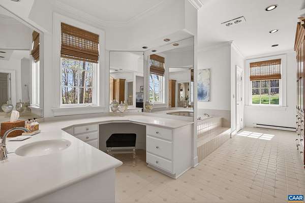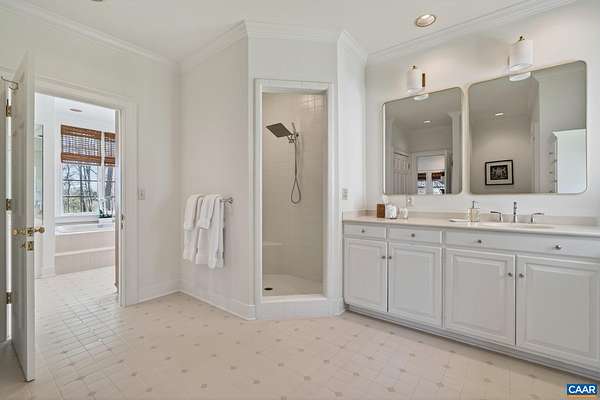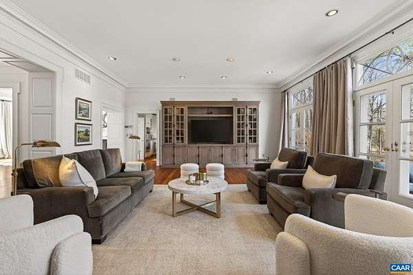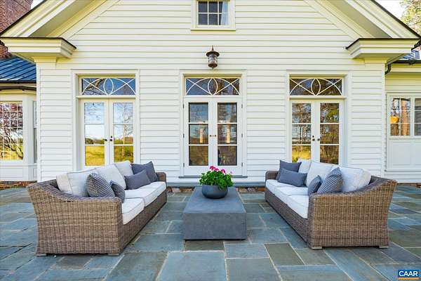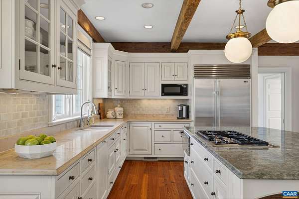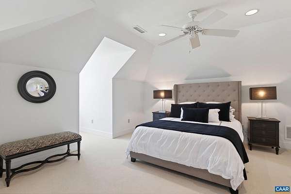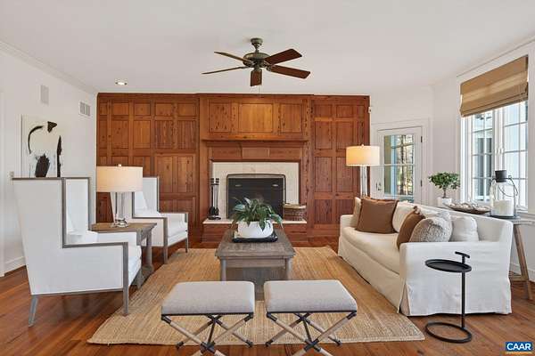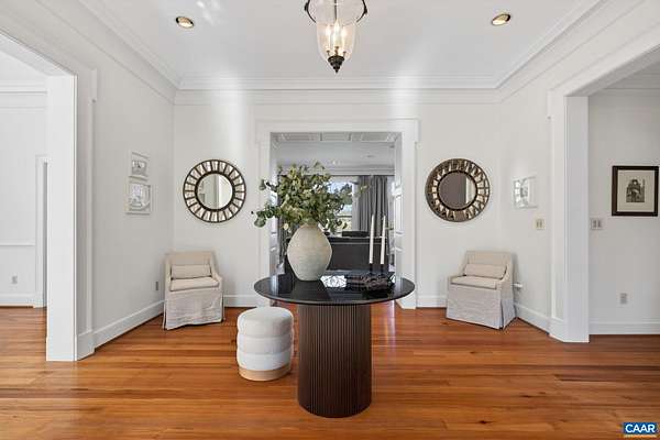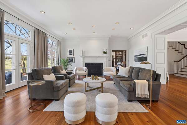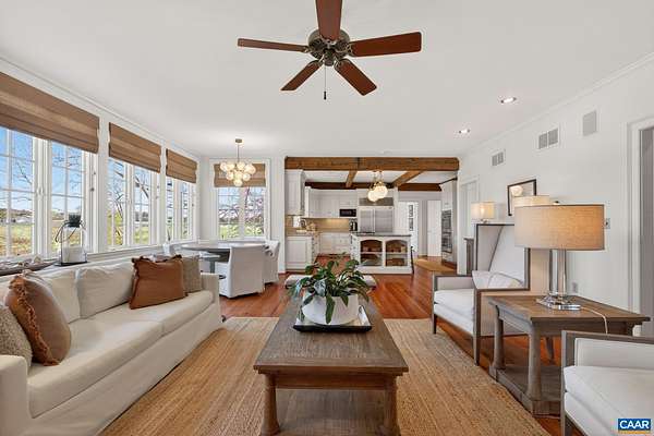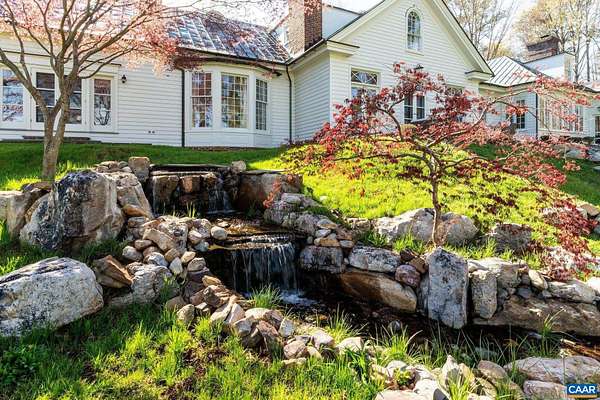 Just off Garth Road and minutes to town, this custom-built home offers sweeping mountain and pastoral views overlooking the protected 175 acres of Foxfield. Built with exceptional craftsmanship, the residence spans approximately 5,500 finished square feet with 4 bedrooms and 6 baths on 5.65 acres of beautifully enhanced landscaping. The light-filled interior features high ceilings, heart pine floors, and a thoughtful floor plan with generous living spaces, including an open kitchen with wood beam ceilings, elegant dining room, formal living room, private home office, and expansive primary suite. A stunning koi pond with waterfall creates a serene focal point outdoors, complemented by mature plantings and peaceful outdoor living areas. The property is fully fenced with deer fencing and includes an automatic gate at the driveway for added privacy. Garth Gate Lane is a private lane with no through traffic and only eight homes, offering a quiet and secluded setting. Recent improvements include new interior and exterior paint, updated fixtures, new carpet, and extensive landscape work. Additional highlights include a copper roof, generator, and quality construction throughout.