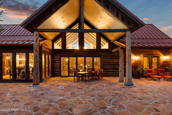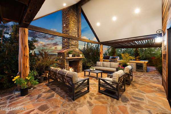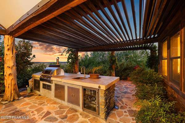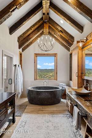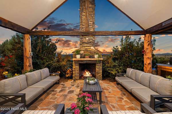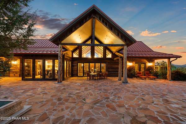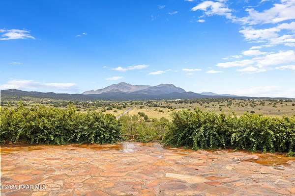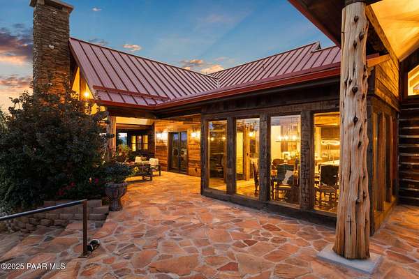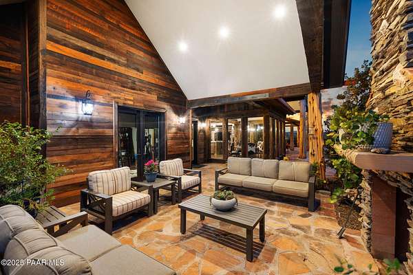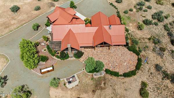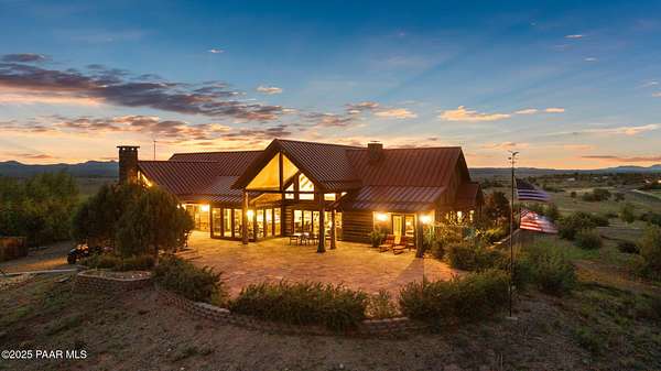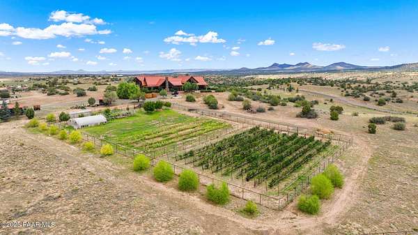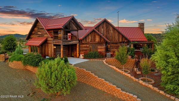 One of a kind Luxury Estate in Prescott, Arizona. Perched on 37 private, gated acres with panoramic views of Granite Mountain and the iconic Arizona sunset skyline, this extraordinary estate is where visionary architecture meets rustic elegance. Spanning over 4,400 square feet, this four-bedroom, four-and-a-half-bathroom masterpiece redefines luxury living while each bedroom features its own en-suite bath, ensuring privacy and comfort for all. Crafted from reclaimed barn wood originally sourced from Indiana and transported across the country, this home is a rare fusion of heritage craftsmanship and modern opulence. The great room is anchored by a hand-carved fireplace surround and mantel imported from Mexico, offering a warm, bespoke focal point. One of the estate's most breathtaking features is the granite soaking tub, expertly carved from a single boulder sourced in Ash Fork and craned into place during construction, it creates a spa-like retreat unmatched in character and scale. Indoor-outdoor living is celebrated with an expansive rear patio that opens up to dramatic, unobstructed views. An outdoor shower off the primary suite enhances the ambiance, seamlessly blending luxury and nature. The oversized attached garage complements a detached 10-car garage, perfect for collectors, enthusiasts, or tinkered with 220 electrical and compressor hookups. Adding to the property's uniqueness is a fully operational vineyard and garden, complete with a dedicated bottling room that could easily be transformed into a charming guest studio. With its unmatched privacy, secure fencing, and gated access, this property is more than just a home, it's an irreplaceable oasis of design and intention. A truly singular estate that blends authenticity, tranquility, and architectural brilliance, it is destined to remain both unforgettable and highly coveted.