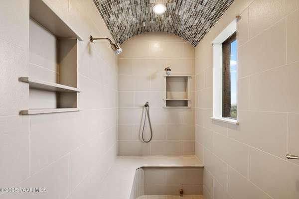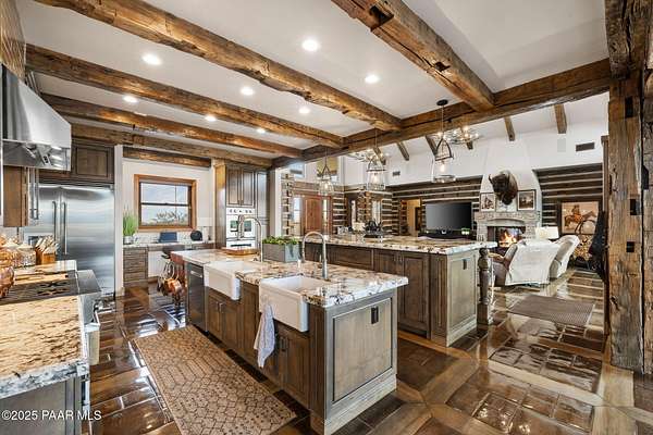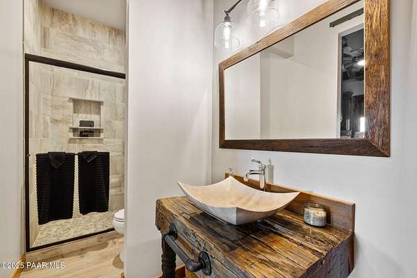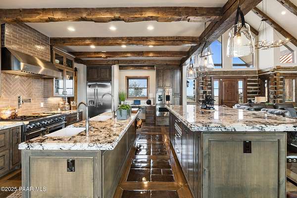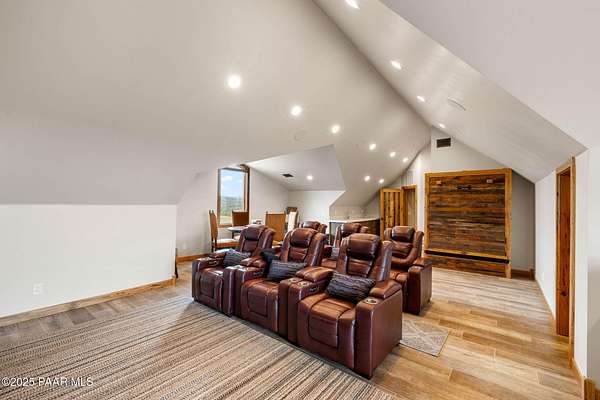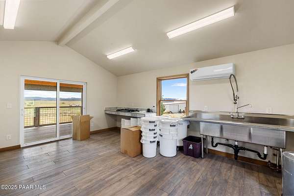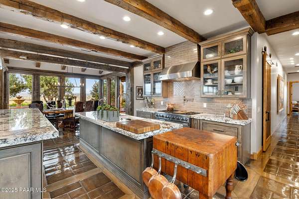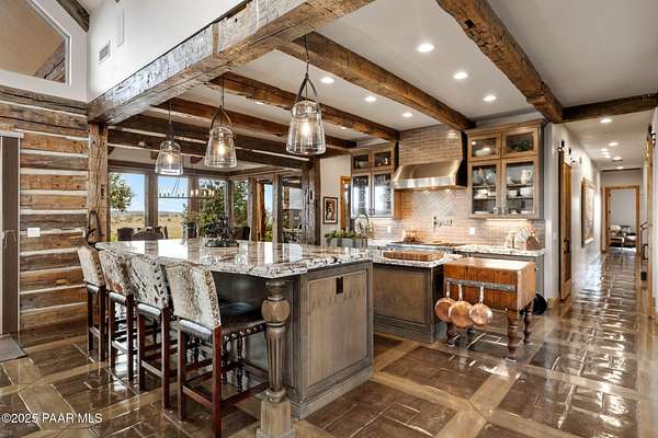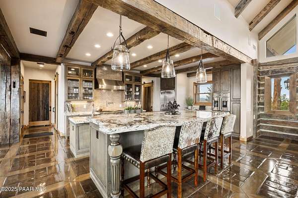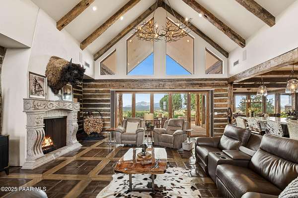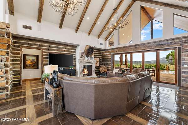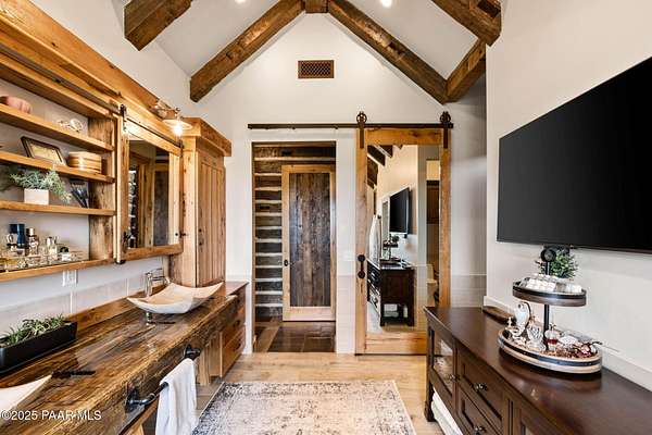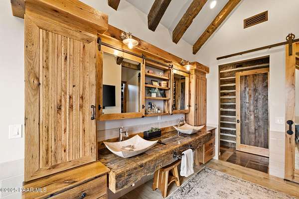 One of a kind Luxury Estate in Prescott, Arizona. Perched on 37 private, gated acres with panoramic views of Granite Mountain and the iconic Arizona sunset skyline, this extraordinary estate is where visionary architecture meets rustic elegance. Spanning over 4,400 square feet, this four-bedroom, four-and-a-half-bathroom masterpiece redefines luxury living while each bedroom features its own en-suite bath, ensuring privacy and comfort for all. Crafted from reclaimed barn wood originally sourced from Indiana and transported across the country, this home is a rare fusion of heritage craftsmanship and modern opulence. The great room is anchored by a hand-carved fireplace surround and mantel imported from Mexico, offering a warm, bespoke focal point. One of the estate's most breathtaking features is the granite soaking tub, expertly carved from a single boulder sourced in Ash Fork and craned into place during construction, it creates a spa-like retreat unmatched in character and scale. Indoor-outdoor living is celebrated with an expansive rear patio that opens up to dramatic, unobstructed views. An outdoor shower off the primary suite enhances the ambiance, seamlessly blending luxury and nature. The oversized attached garage complements a detached 10-car garage, perfect for collectors, enthusiasts, or tinkered with 220 electrical and compressor hookups. Adding to the property's uniqueness is a fully operational vineyard and garden, complete with a dedicated bottling room that could easily be transformed into a charming guest studio. With its unmatched privacy, secure fencing, and gated access, this property is more than just a home, it's an irreplaceable oasis of design and intention. A truly singular estate that blends authenticity, tranquility, and architectural brilliance, it is destined to remain both unforgettable and highly coveted.