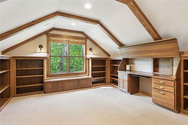 The main-floor primary suite offers a fireplace, spa-like bath with soaking tub and walk-in shower, and a custom closet system. Upstairs, find two bedrooms and a vaulted office with custom cabinetry, connected by a dramatic catwalk.