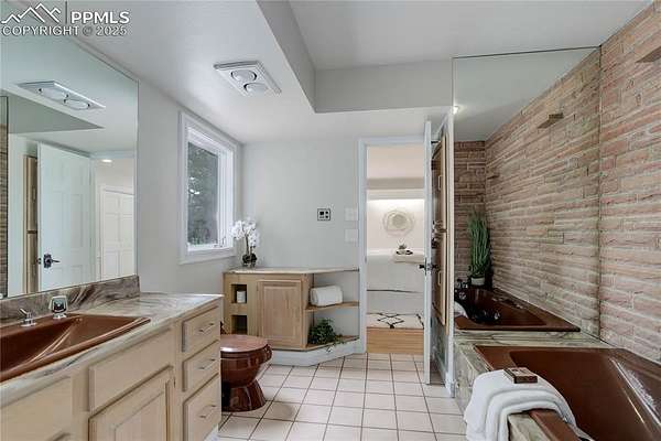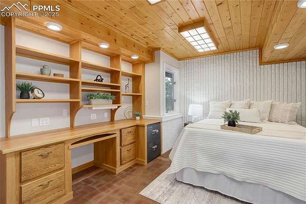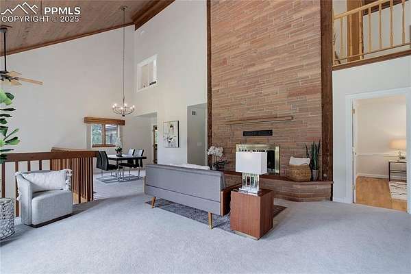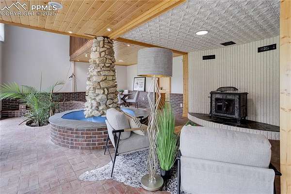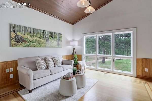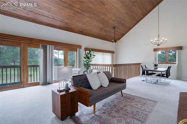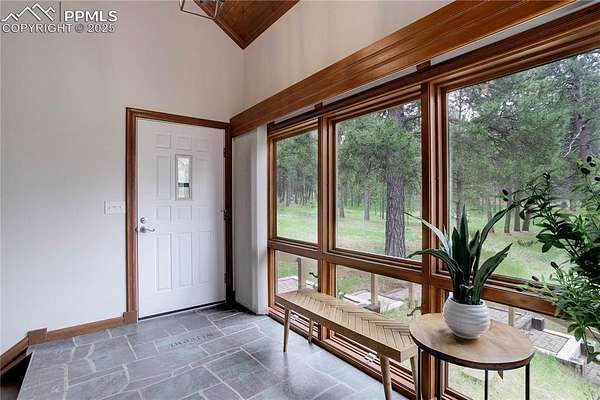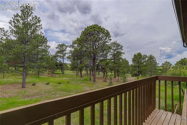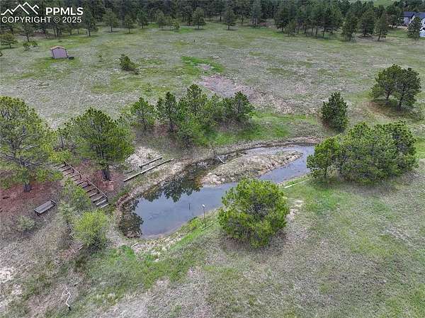 Tucked behind a canopy of mature Ponderosa pines, this tranquil property welcomes with an incredible architectural driveway leading to a portico with porch swing and fenced grounds. The home is surrounded by a multi-level terraced garden with paved walkways and walk-out access. Inside, the living room features soaring wood cathedral ceilings, a dramatic two-story natural rock fireplace, and south-facing windows for relaxing natural views and soothing passive solar warmth. The kitchen offers heated slate floors, a Jenn Air range, a hot water tap, and access to a covered west-facing deck with views stretching to Pikes Peak and the Front Range. The primary suite includes an oversized walk-in closet and an en-suite bath with radiant heat hardwood floors. The upstairs loft doubles as an office with a gas fireplace & built-in floor-to-ceiling shelving and glass-fronted cabinets. This level also offers a bedroom & bath. Downstairs, enjoy the peaceful sound of a cascading waterfall into a circular koi pond, part of a two-story atrium designed for year-round indoor gardening. Off of the walk-out family room, a secondary suite with attached bath is ready to accommodate guests. The finished garage includes an RV-height door and extra deep parking bays. Additional features include two wells, a dedicated workshop, laundry room with sink and chute, and zoning that permits livestock. Approximately half the acreage is mitigated, blending forest and native grass meadow that descends to a pond that is both spring fed & filled by the East Cherry Creek. Wildlife is abundant, and privacy is preserved while still offering easy access to Herring Road.
