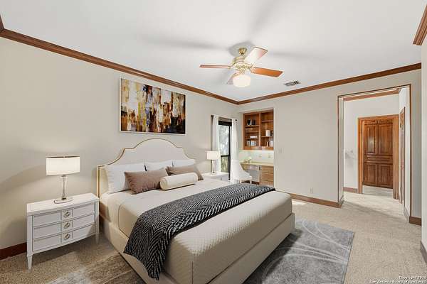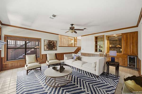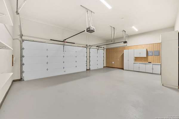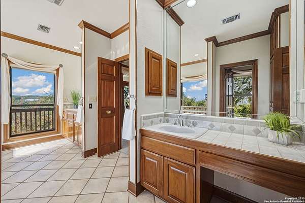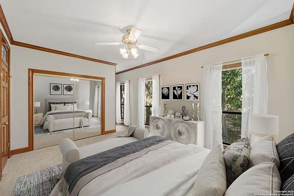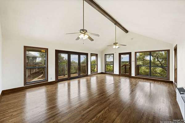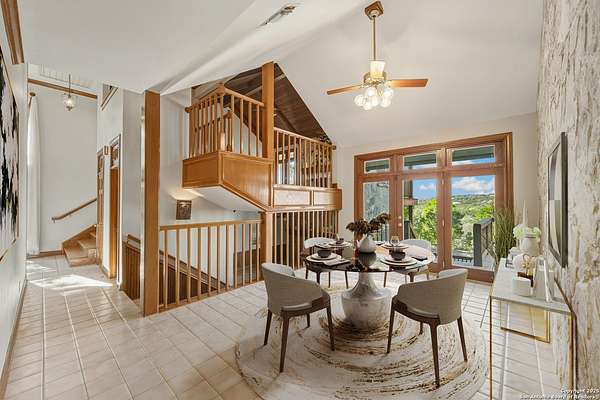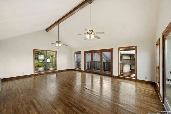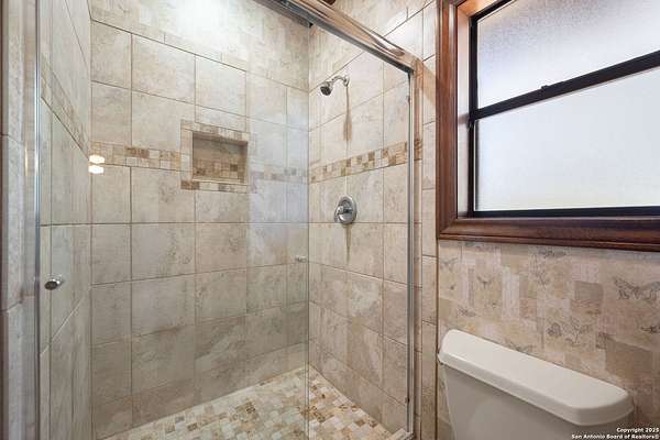 Picture arriving at this Texas Hill Country home tucked into a beautifully treed setting, with an inviting outdoor oasis waiting quietly behind the house. A separate detached studio or flex space adds versatility to the property. Easy guest suite with an additional of a bathroom. The sparkling, geometric-shaped pool glistens in the sunlight, bordered by stone hardscaping and natural landscaping that create a peaceful sense of retreat. Multiple seating areas invite you to imagine long afternoons by the raised spa or gatherings with friends on the generous decking. Tiered planters, mature greenery, and stone retaining walls blend seamlessly with the Hill Country scenery. Following the stone pathway toward the covered front entry, you reach a beautifully detailed front door with sidelights-an elegant welcome that hints at the craftsmanship throughout the home. Crossing the threshold, you enter a foyer filled with natural light leading you toward the upper level, where the first living room becomes the heart of the home. Up a short set of wide wood steps, this dramatic gathering space opens under a vaulted tongue-and-groove ceiling with exposed beams. A floor-to-ceiling stone fireplace anchors the room, while large windows frame the surrounding treetops. Double glass doors lead to an elevated deck with sweeping Hill Country vistas-an ideal spot for morning coffee or unwinding in the evening. Just off this room, the wood-paneled study offers a quiet retreat, featuring extensive built-ins, shelving, cabinetry, and desk areas. The top level continues into the primary suite, a peaceful bedroom framed by a vaulted ceiling and a wall of windows. Double doors open to a balcony. In the en-suite bath, two large picture windows bring the scenery indoors, with dual vanities, a separate glass-block shower, a soaking tub, and a large walk-in closet with built-ins. Descending back to the main level, you will discover the kitchen. A center island anchors the room, skylights brighten the workspace, and granite countertops pair with travertine backsplashes. Stainless steel appliances, including a gas cooktop, and abundant cabinetry support everyday cooking. Just beyond, the breakfast area-with its floor-to-ceiling windows-creates an inviting spot for casual dining or stepping onto the deck for fresh air. To the right of the foyer, the formal dining room features warm wood flooring, a chandelier, and a full wall of glass-front cabinetry, ideal for hosting and offering direct access to the kitchen. Still on this level, you'll find a private secondary bedroom with its own en-suite bath. Nearby, the laundry room offers a sink, plenty of storage, and workspace, and from here, you enter the oversized garage, where the finished floor and built-in cabinetry make staying organized easy. From the kitchen, step down to the lower level where you will find the second living room that centers around a full stone fireplace with an extended mantel, along with built-in cabinetry, a wet bar, and durable tile flooring. You will also enjoy direct access to the pool area, blending indoor comfort with outdoor enjoyment. Beyond this living area, a hallway leads to three secondary bedrooms. Two share an updated Jack-and-Jill bath with separate vanities and a shared walk-in shower. The third bedroom has its own private en-suite bath, and each bedroom includes ceiling fans and large windows with natural light and views. Finally, the setting of this home enhances the experience further. Though close to every service and amenity San Antonio provides, its rural character offers wildlife, serenity, and the freedom of no HOA-giving you the rare opportunity to enjoy both convenience and nature.