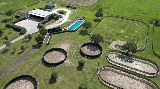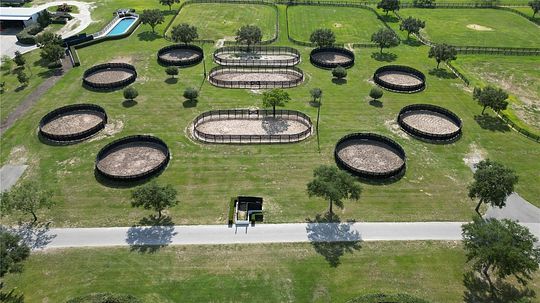Among the remarkable facilities is an equestrian swimming pool complete with a deck and secure PVC fencing for safety, (7) European walkers, (12) round pens, (3) riding arenas, (42) lush green paddocks, automatic waterers, an office, (2) workshops/storage buildings, a gated entrance, underground piping for water/sewer lines, and ornamental landscaping.