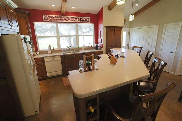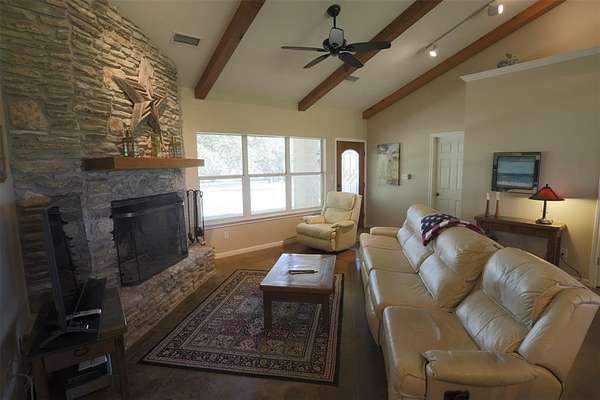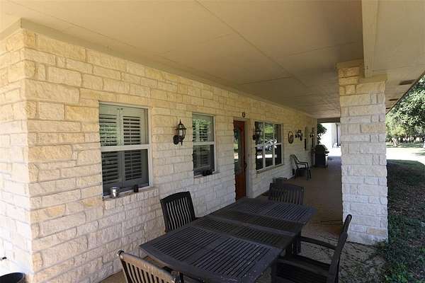 Discover the ultimate blend of rustic elegance and wide-open freedom with this remarkable stone ranch home set on 233 acres of rolling countryside. With rock veneer siding, a durable metal roof, and a full wrap-around porch, this 4-bedroom, 2-bath retreat is built for both style and serenity. Inside, stained concrete floors, granite countertops, and a woodburning fireplace create a warm, inviting atmosphere. Thoughtfully designed for year-round comfort, the home includes two HVAC systems, two water heaters, and a built-in tornado shelter safe room for added security and peace of mind. The land is equally impressive: two stocked ponds, frontage along the scenic banks of Hog Creek, and access to the mouth of an approximately 50-acre lake make this property a haven for outdoor living. Whether you're fishing, kayaking, or simply enjoying the views, water is never far away. A 2,800 sqft barn with four oversized sliding doors provides endless possibilities--ideal for equipment storage, livestock, or a dream workshop. Whether you're seeking a private retreat, a working ranch, or an outdoorsman's paradise, this one-of-a-kind property delivers room to roam, water to explore, and a home to love.