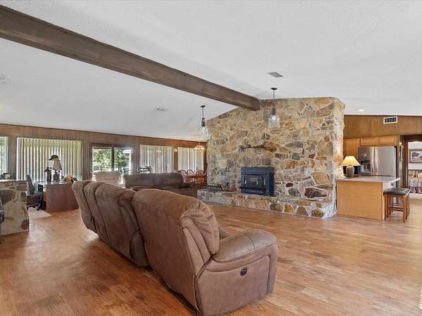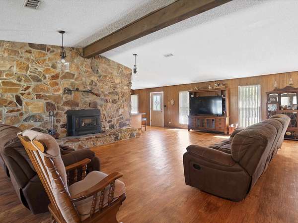 HUGE PRICE IMPROVEMENT!! Pride of ownership in this owner-built home, ten minutes from the Barnwell Mountain Recreational Area and in IMMACULATE Condition. BRING YOUR off-road vehicles here! Plenty of room – no restrictions!! Drive up to the electric gate and enter the home’s private driveway. As you park under the spacious 4 car covered carport you will feel like you entered a private retreat in the piney woods of East Texas with frequent wildlife sightings. Exterior features include 2 outbuildings. One was previously used as a pool house and could easily be converted to guest quarters, a workshop, mancave, or hobby shop. For added peace of mind, there is also an underground storm shelter. A 500-gallon propane tank furnishes gas to the home. This beautifully crafted home features an extra-large living room with vaulted ceilings and a stone fireplace, making the entry truly grand. Exterior walls are lined in cedar planks. The large kitchen has an electric stove, but a gas line is available if you want to convert it to gas, and the dining room has a built-in hutch but can easily be extended to include additional kitchen space. The primary bedroom has a bathroom and walk-in closet. The two additional bedrooms share an updated Jack and Jill bathroom, and the spacious laundry room has plenty of storage. The oversized, covered back patio is inviting and overlooks the backyard and fully fenced pasture. This single owner home has been well maintained, and age has just made it better. Cedar planks line the exterior walls, which have been wrapped in siding to match the exterior stone, giving it a country home feel. The metal roof is around 10 years old and is in great condition with years of life remaining. Don’t let the age of this home fool you – you absolutely must see this home to appreciate its craftsmanship, attention to deal, and pride of ownership. An opportunity to purchase a home in this condition and location is a rare find. If you’re looking for peace, quiet, and a home that has stood the test of time, look no further. This would make a perfect forever home, weekend getaway, or an investment property. Schedule a showing today