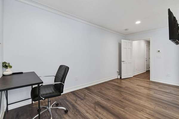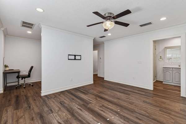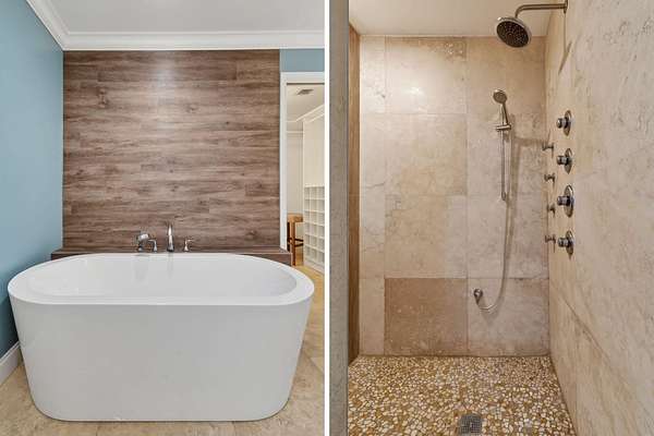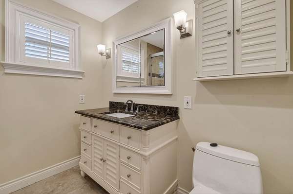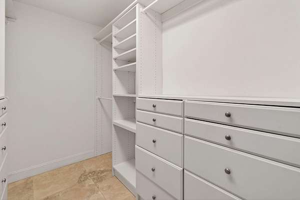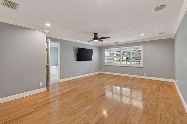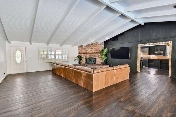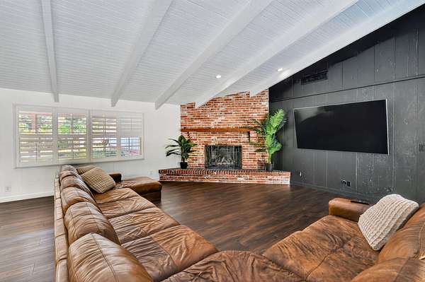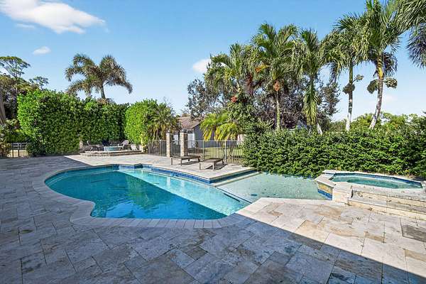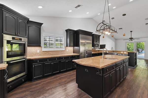 Set on 1.69 acres in 'Loxahatchee Groves', this home offers privacy, generous space, and comfortable indoor and outdoor living. The living room features impact windows, vaulted ceilings, a wood-burning fireplace, and a bar area with a wine cooler, icemaker, wet bar, and built-in TV. The kitchen includes a center island with sink and electric access, a six-burner Thermador gas range, Miele dual wall ovens, and Subzero refrigerator and freezer. Plantation shutters and laminate flooring run throughout much of the home. The primary suite offers a spacious sitting area, custom built-in closet wall, and a beautifully finished bathroom with a garden tub, walk-in shower with glass enclosure, mosaic tile accents, and a vanity at the sink.