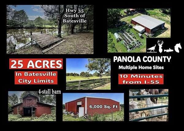 This property is on the south side of Batesville inside city limits & is a ten-minute drive to I-55. Located in a popular residential area, it makes a nice setup for multiple homesites, equestrians, a hobby farm, or a small hunting retreat. The tract is entirely fenced & the owners have kept horses, donkeys, goats, & sheep in the pastures, & lots of chickens in the coop! Access is through a gated shared private drive with two homes, but there's over 300 feet of frontage on Hwy 35. This offers multiple options for building a private drive/drives in the future, if desired. An impressive 6,000 square foot workshop/ equipment shed with 220 power & water takes care of all your hobby & storage needs. There's also a wired and plumbed 4-stall barn with tack room, a small stocked pond, plenty of fruit-bearing vines & trees, & over seven wooded acres of big timber & a creek on the back of the property. Deer & turkeys galore! Build your dream home & enjoy hunting & fishing on your own place.