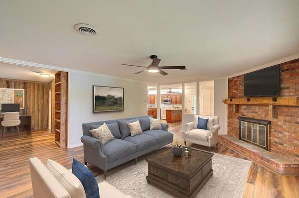 - Attic Fan, Attic Stairs-Disappearing, Bookcases, Cable Available, Ceiling Fan, Ceilings-Smooth, Closet/Cabinet Pantry, Countertops-Solid Surface, Fireplace, Gas Logs, Open Floor Plan, Smoke Detector, Walk in Closet