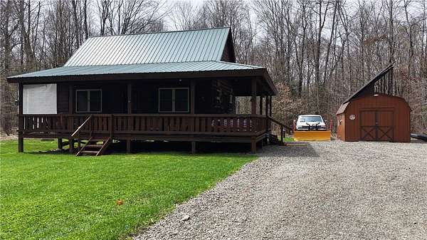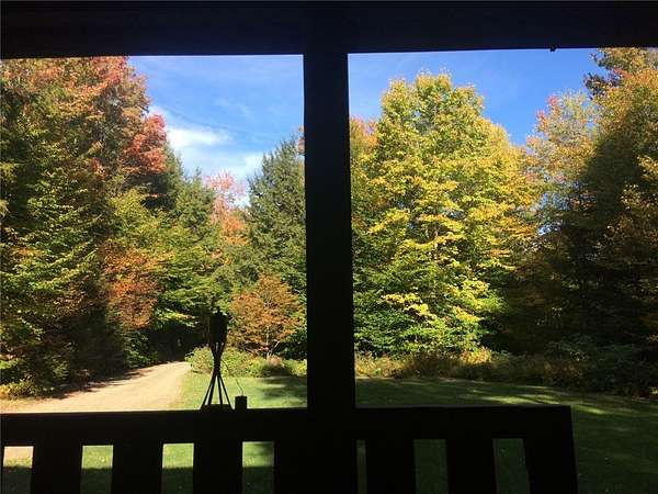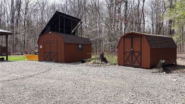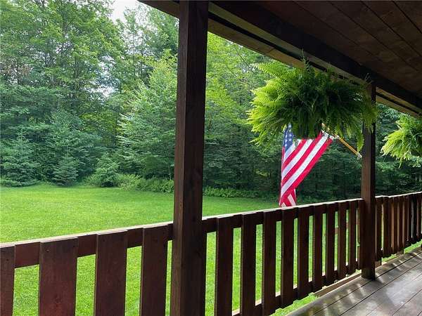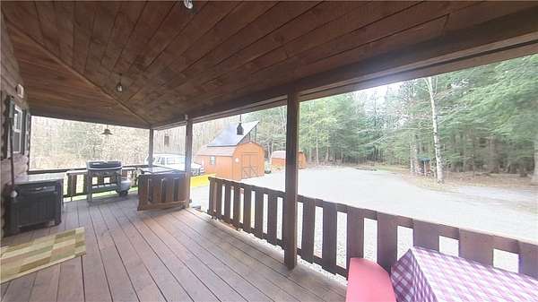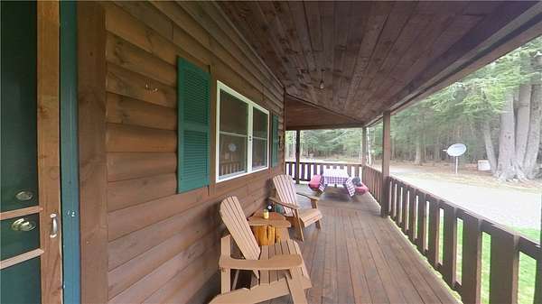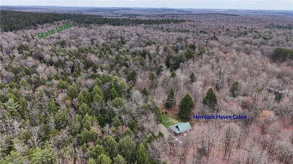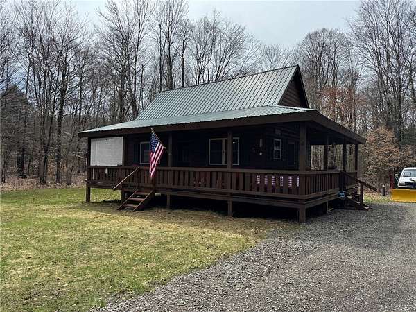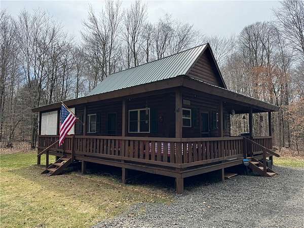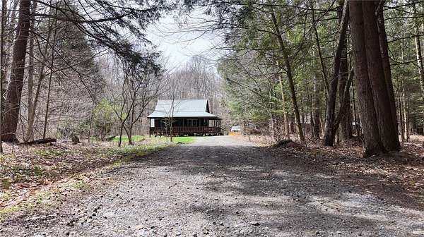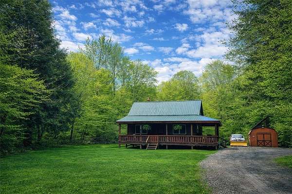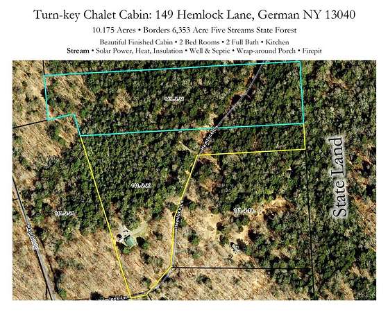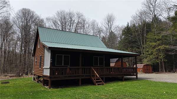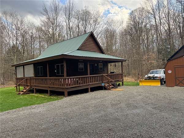 Welcome to Hemlock Haven Cabin! Beautifully finished chalet-style cabin tucked away in private Strongs Brook Acres. True wood interior with tongue-in-groove, wood floors and escape-to-nature decor, this is an escape from city-life. Offering all the comforts of home, with the ease of automation, this off-grid haven includes internet, comprehensive solar-power system, kitchen, comfortable bathroom with tub, drilled well and septic. Everything up-to-code, the builder dreamed of an oasis without the stress. Monitor from your phone when away. Enjoy perfection when in Upstate New York recreational territory. Travel down the long driveway as your log-side dream cabin comes into view. Wrap around porch with multiple seating areas and chimenea - a space for quiet wildlife-watching or festive parties. The pine covered Great Room is an open-floor plan. Custom dining table, smartly designed kitchen, comfortable living room, soaring 2-story ceilings with exposed beams - the cabin of your dreams! First floor bedroom, utility closet (with on-demand water heater) and full bath finish out the first floor. The second floor offers a private bedroom loft with wide plank door - your elegant treehouse in the forest. The Solar-Power Utility Shed includes heat, LAUNDRY AREA and separate space for the backup generator. The over 10 acre double lot includes a FIRE PIT, cleared area for additional RV or campsite... and a picturesque STREAM to draw in the wildlife. Bordering the 6,353 acre Five-Streams State Forest: hunt, hike, snowmobile, fish - find endless outdoor fun for adventure-seekers. This hidden gem offers top-notch amenities for an off-grid escape - don't let this rare opportunity slip away!
