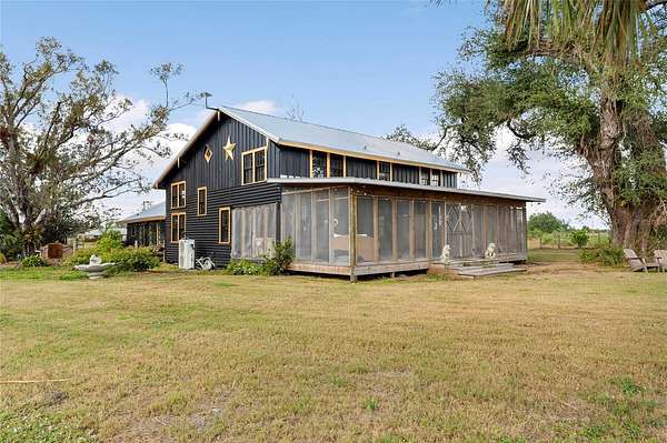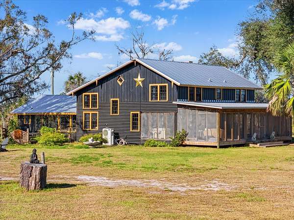 Step into 'Old Florida' with this fully restored historic farmhouse on 8 acres in rural Myakka City. Originally built in 1941 by Clint and Eva Hutches, both former Manatee County Sheriffs, this authentic log home is steeped in history and charm. Restored by French designer, Gaelle Wizenberg, this home has been beautifully reimagined while preserving its original, historic character. If you've ever dreamed of living 'off the grid', becoming fully sustainable, and growing your own food, while still being within close proximity to modern conveniences such as shopping & dining found at Lakewood Ranch or the stunning beaches of Lido & Siesta Key, your dream is now a reality. The restoration of this home included extensive updates such as a new metal roof, AC units, plumbing, tankless water heater, well equipment, and a top-of-the-line solar system with batteries, which powers the entire property. As you approach the property, you'll be greeted by the awe-inspiring beauty of the home and its surroundings. The soaring vaulted ceilings and exposed beams reflect the beautiful, rustic heritage of Florida's cattle ranching era. The rich, warm tones of cedar and tidewater pecky cypress wood create an inviting, natural atmosphere. The centerpiece of the home is an impressive brick fireplace, while the floors feature original pine and ash wood. For the culinary enthusiast, the farmhouse boasts two kitchens: a spacious prep kitchen with ample pantry storage, and a chef's kitchen designed to impress. Features include a state-of-the-art porcelain island, black cabinetry accented with gold hardware, thick butcher block countertops, and high-end appliances such as a Bertazzoni 6-burner gas stove, Fisher & Paykel double-drawer dishwasher, and a large double-door fridge/freezer. The kitchen offers a direct view of the thriving vegetable garden and fruit tree grove. The home features a new, fully screened front porch, perfect for relaxing while enjoying the shade of a majestic Grand Oak in the front yard. The property is a true retreat, having served as a yoga and wellness center, as well as an educational hub for students interested in organic and regenerative farming practices. The property has a thriving "food forest" with a wide variety of vegetables, herbs, and fruit trees, including cabbage, arugula, tomatoes, cucumbers, kale, citrus, papaya, mango, avocados, and much more. A true homesteader's dream, this property also has multiple chicken coops and even a rabbit hutch. The property also includes a charming cabin, also built in 1941, that has a full bathroom and kitchenette; ideal for use as a guest suite or office. There are 2 large pole barns that provide ample storage and could easily be converted into horse stables. Located on a quiet, dead-end road, the property offers privacy and tranquility. It backs up to the 4,500-acre Blackbeard Ranch and is just minutes from Terra Nova Equestrian Center, making it ideal for horse lovers and equestrian pursuits. Additional amenities are on the horizon, including the new Miakka Golf Club just 2 miles away, and the vibrant communities of Waterside and Lakewood Ranch are just a 30-minute drive. Mineral rights convey with the 3 parcels. Bitcoin is accepted for purchase of this property.