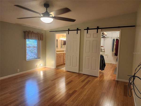 Split bedrooms plan and Master Suite has an extra room adjoining,which could be a exercise room, office, sitting room just to name a few. Large (approx 16x15) Suite has 3 solid core barn doors to close off the double walk in closet ROOMs and for the entrance door. Beautifully done Master Bath. (approx 13x9)