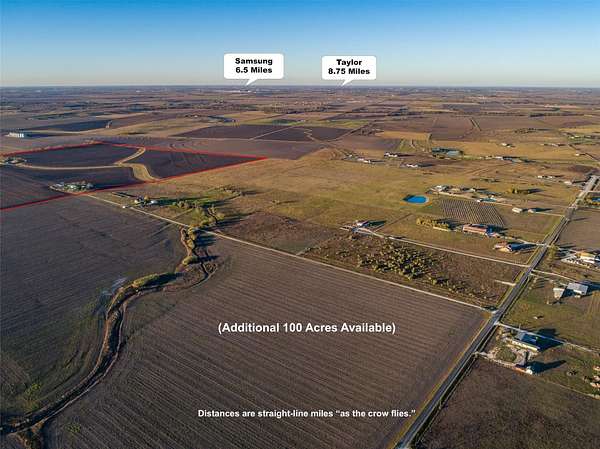 *Additional 100 acres available with road frontage; call for details* Nestled southwest of Taylor, near the colossal Samsung site, this 231-acre working farm is an investment gem in the rapidly expanding corridor east of Austin. Proximity to major players like Samsung, Tesla, and the Amazon distribution center positions this property for long-term stability and potential development. With gentle elevation changes, the property boasts panoramic views of picturesque farms, the developing countryside, and nearby new ranchettes. The property, currently productive cropland under lease, features two half-acre ponds, one with a fishing dock. Access to the 231 acres is provided by a 25-foot recorded shared access easement drive from the paved Werchan Lane. Embrace the possibilities in this prime location, poised amidst industry giants and primed to capitalize on the region's vibrant economic growth, and just four miles from the 570-acre Lund Farm Community set to break ground in 2024. The property is 3 miles west of Coupland, 10 miles south of the massive Samsung plant in Taylor, 8 miles north of Elgin, 10 miles north of Manor, 16 miles east of Toll 130, 26 miles northeast of the Austin airport, 13 miles northeast of the 290 Toll Road with easy access to Austin, and 19 miles east of Round Rock. See soil map in Documents. The 1975-built house is not habitable, and the barns may be rehabbed for future use. Minerals are negotiable. Manville Water meter. Property is ideal for a dove hunting lease. **The sellers intend to file deed restrictions at closing. Draft available upon request.