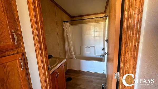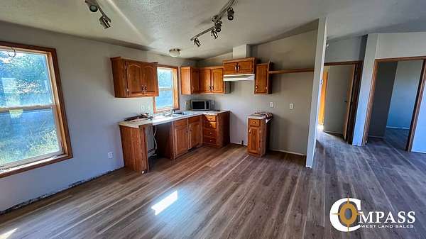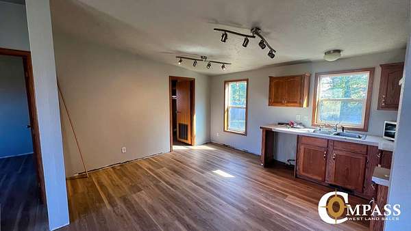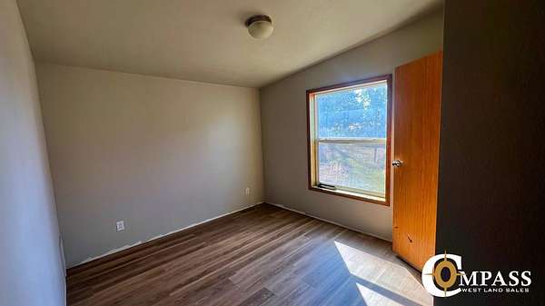 A double-wide mobile home sits on the property. Recently updated with fresh paint and new flooring, it still requires finishing work and is not yet move-in ready. It serves as a practical base of operations or temporary housing while plans for permanent development are considered.