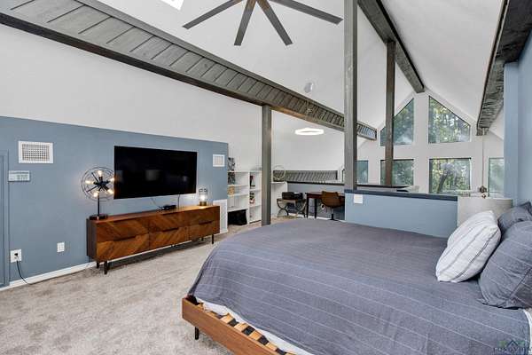 - Carpeting, Ceiling Fan, High Ceilings, Vinyl Flooring