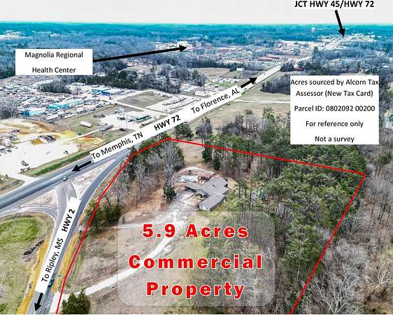 Now Available. 5.9 commercial acres in the Corinth City Limits. Great exposure at the JCT of HWY 72 and 2. Traffic counts of 16,000 and 3,700 nearby. Ideal access w/850'+ hwy. frontage. Short walk to Hospital, Pharma, banks, restaurants, conv. stores, markets. Set up for veterinarian office, kennel, private office ,1/2 bath w/shower. Well built timber frame barn w/stairs to large storage area above w/elec. In ground pool, 2 bay carport, Apt. attached to clinic rented for $850/mo. At the transition where the city meets fresh air. Great view of the Tuscumbia watershed and expansive row crop fields but untouched by the flood plain. Flush w/parking, green space, mature indigenous trees, eagles nest. Property characteristics that open many avenues of it's best and highest use.