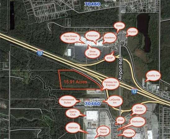 Est $14,567/mo15.91 acres with excellent visibility and accessibility from I-12 and Airport Rd. with 1200' of frontage on Frontage Rd. This tract is adjacent to a Holiday Inn Express to the south and is the northern anchor to a Sam's Club, Walmart, LaQuinta Inn, Homewood Suites and a Starbucks. This retail hub of the I-12/Airport Rd, intersection also includes Academy Sports, Petsmart, Ross Dress for Less, Shoe Carnival and a Comfort Inn. Zoned C-4 Highway Commercial District. Priced $355,000 below April '23 appraisal.
