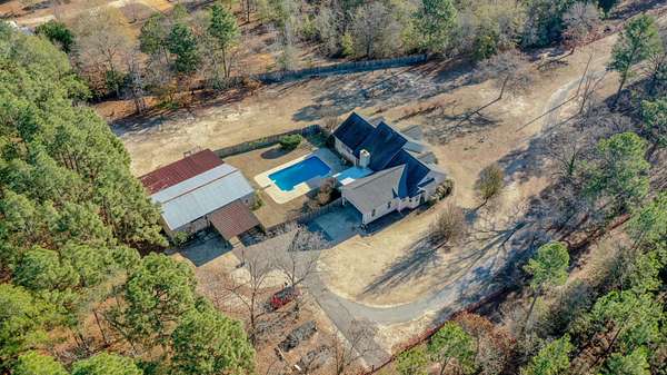 Nestled on 12 fully fenced, wooded acres, this impressive 4-bedroom, 4.5-bathroom property offers space, privacy, and endless possibilities. A classic rocking chair front porch welcomes you into a bright and inviting interior where a formal living area flows into a stunning great room featuring vaulted ceilings and a fireplace as the focal point. The kitchen is warm and functional with oak cabinetry, appliances, a center island, and a sun-filled eat-in area ideal for everyday living. The spacious primary suite provides a relaxing retreat with an en suite featuring a double-sink vanity, garden tub with tile surround, and a separate shower. Upstairs features the fourth bedroom along with two versatile flex spaces-one currently used as a bonus room and another with a dedicated closet just off the room, allowing it to function as a potential fifth bedroom, home office, or guest space. These adaptable spaces provide options to fit a variety of lifestyles and needs. Outdoors, enjoy a backyard oasis with a pool, covered porch, and patio designed for gatherings, along with a covered deck overlooking the serene property. A standout feature is the approximately 2,000-square-foot shop with power, offering a garage workshop, additional recreational space, a bedroom, bathroom, and kitchenette-ideal for guests, hobbies, or a home business. Pens and fenced areas for animals enhance the property's versatility, making this exceptional home a rare opportunity to enjoy peaceful country living with room to live, work, and play. Located minutes from I-20 and downtown Aiken, this property truly has it all.