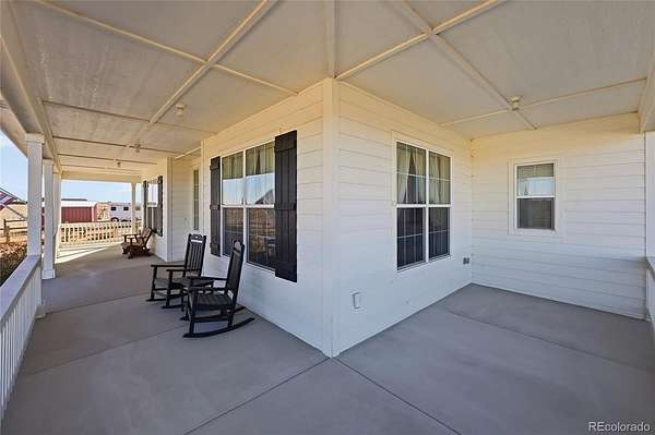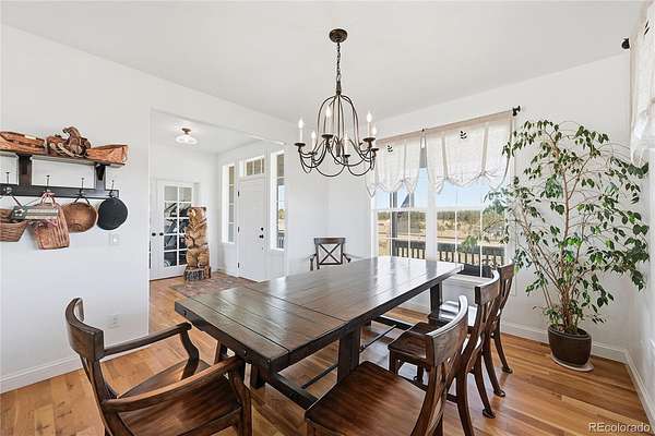 The home is elevated on the property, maximizing views and privacy, with expansive front and back porches ideal for enjoying Colorado's sunsets and wide-open skies. Inside, an open and airy floor plan is filled with natural light and timeless finishes. Hardwood floors are complemented by a distinctive brick inlay in the kitchen, entryway, and mudroom, adding warmth and character throughout.