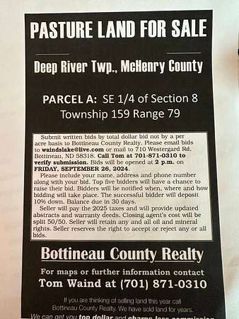 Est $1,096/moDEEP RIVER TWP., MCHENRY COUNTY. PARCEL A: SE 1/4 of Section 8 Township 159. Range 79 Submit written bids by total dollar bid not by a per acre basis. Please email bids or mail to 710 Westergard Rd. Bottineau, ND 58318. Call Tom Waind to verify submission. Bids will be opened at 2 p.m.on Friday, September 26, 2025. Please include your name, address and phone number along with your bid.