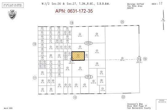 15 Acres (APN: 0631-172-35) GPS: 34.22973, -116.34283 This 15 acre property is located in Joshua Tree, CA. San Bernardino County has zoned this property Homestead Valley/Rural Living 5 Ac Minimum (HV/RL-5). The primary use is residential homes, some of the other permitted uses within this zoning are: accessory crop production, agricultural accessory structure, small family daycare facility or licensed residential care facility. Commercial renewable energy facilities are permitted in RL zoning according to the San Bernardino Development Code. Overhead electricity is available approx 2900 ft northwest of the property near Winters Rd and Willy Way. Joshua Basin Water District services the area. Residents have septic tanks for their sewer needs and propane tanks for their gas needs. Floodway maps show the property is not in any flood zones and there are no blue lines within the property boundaries. Living in Joshua Tree, CA, offers a unique blend of natural beauty and laid-back desert living. Imagine building your desert getaway and waking up to bright desert sunrises, panoramic views of rugged mountains, or dark starry nights. Endless opportunities for outdoor adventures are a short drive away in Joshua Tree National Park. There's always something exciting to explore. Plus, the tight-knit community fosters a sense of belonging, with local shops, art galleries, and events showcasing the area's vibrant culture. Whether you're seeking tranquility or adventure, Joshua Tree welcomes you with open arms. This property does not yet have an address. While the boundary lines on the map offer a glimpse, they are only approximate. A Buyer should verify boundaries, zoning and utilities, ensuring every aspect aligns with their vision for the property. Nearby properties also for sale. GPS: 34.22973, -116.34283