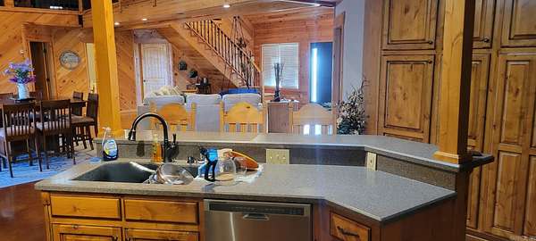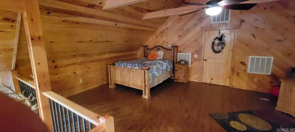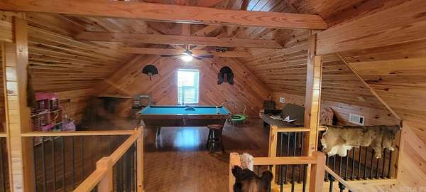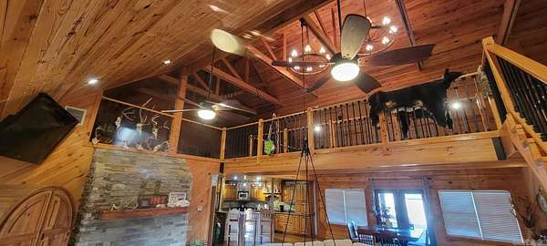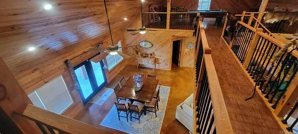 Escape to the peace and privacy of rural living with this stunning 3,195 sq ft two-story home in Wynne, Arkansas. Set against open farmland and surrounded by mature trees, this one-of-a-kind three bedroom, two bathroom property blends rustic charm with spacious, functional design. The exterior welcomes you with a classic country aesthetic, complete with a rap around covered porch perfect for rocking chairs and quiet mornings. Inside, the home opens to soaring ceilings, warm wood finishes throughout, and an open-concept layout that feels both grand and inviting. The main living space features a dramatic vaulted ceiling, abundant natural light, and seamless flow into the dining area and kitchen—ideal for everyday living or entertaining. The kitchen offers ample cabinetry and counter space while maintaining the home’s cohesive rustic character. A standout feature is the second-story loft and balcony walkway overlooking the main living area, adding architectural interest and flexible space for a home office, recreation area, or guest accommodations. The home’s thoughtful layout provides plenty of room for relaxation, work, and gathering, all while maintaining a cozy cabin-style.
