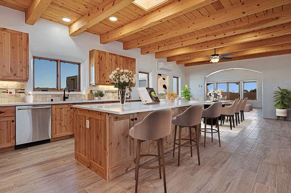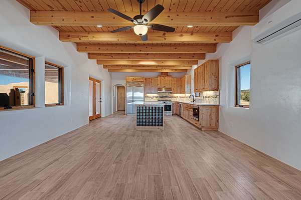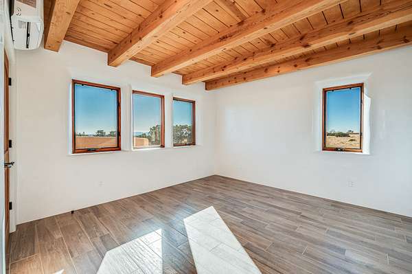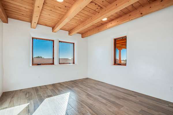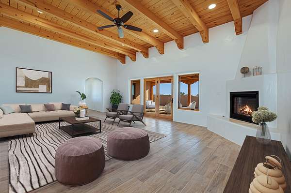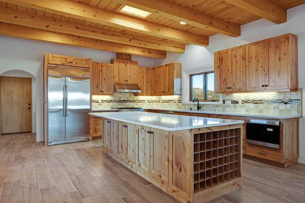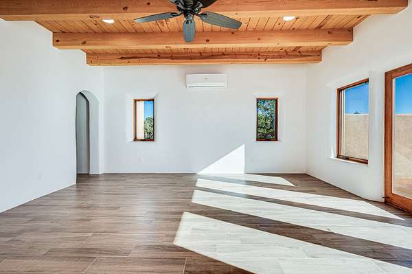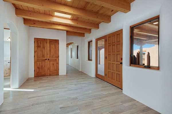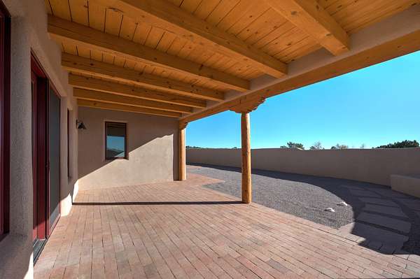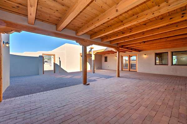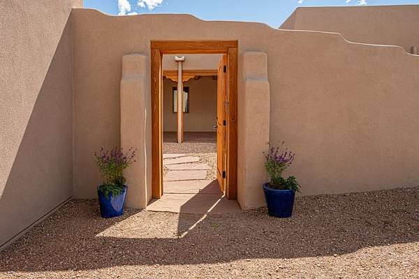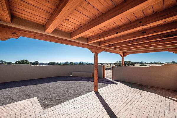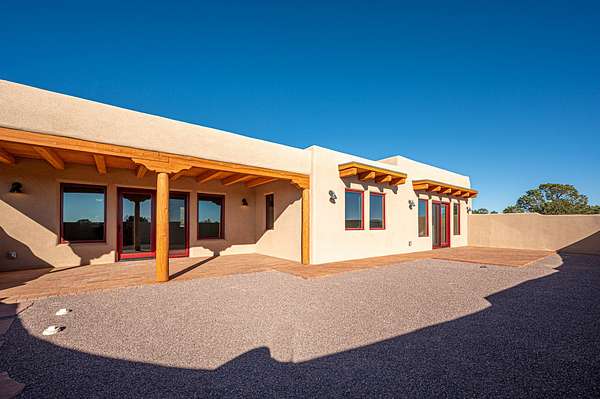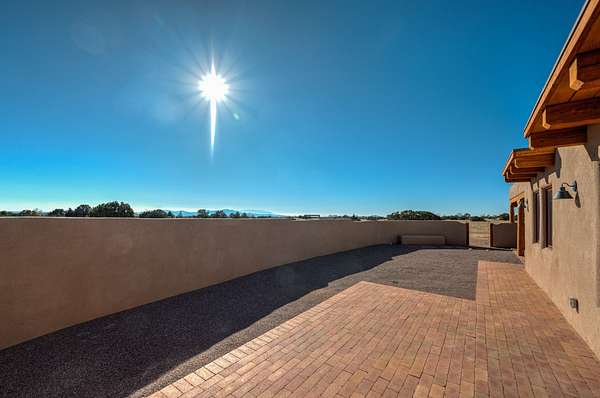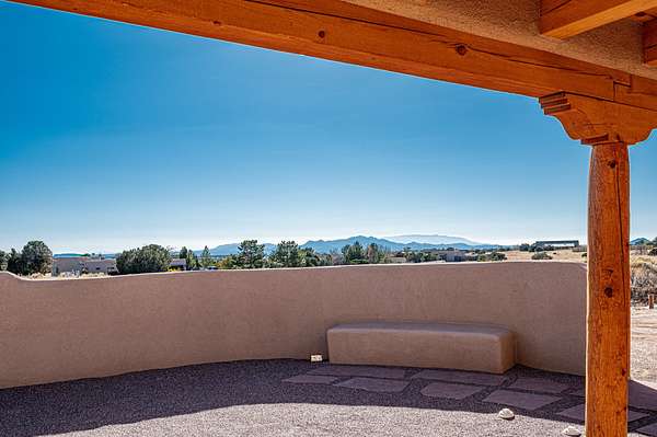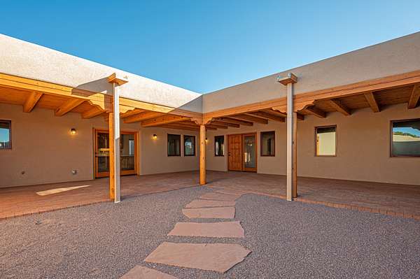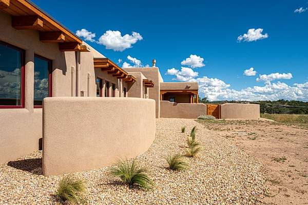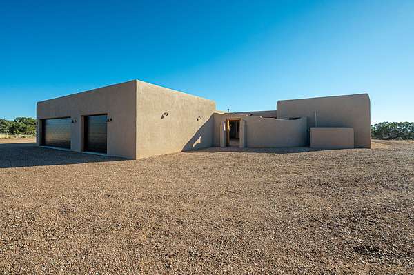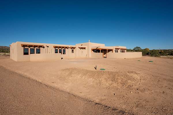Stunning Adobe contemporary pueblo masterpiece by one of Santa Fe's premier adobe builders, Jeff Fagley of Shaylube Construction. Spec home never been lived in waiting for the first owner to enjoy. Open plan design with dramatic corbelled beam ceiling and Kiva fireplace in great room, tiled floors and gleaming thick smooth plastered walls throughout complement the classic elements of Santa Fe style. Spacious feel with high ceilings throughout, split 3 bedrooms plus office, large owners suite with private walled portal, 4 bathrooms separate guest suite. Natural gas radiant heat plus 5 mini splits for heating and cooling complementing the radiant in floor heating and passive solar design. A sunny chefs kitchen with butlers pantry and central island, large formal dining area opening to a wraparound portal for private outside dining and entertainment. A walled courtyard entry with wrap around portal also provides the access to both main home and guest quarters. There is a second privacy walled south courtyard with bricked portals accessed from living room and master suite also excellent for sunset mountain viewing. Roof drainage to 2 cisterns already installed underground catch the rainfall for landscaping. A large 3 car garage for lots of toys or hobbies, plenty of guest parking and lovely view with 7+acres to enjoy. Horses allowed. Enjoy access to local Eldorado area shopping, schools, senior center and library plus only minutes into Santa Fe.