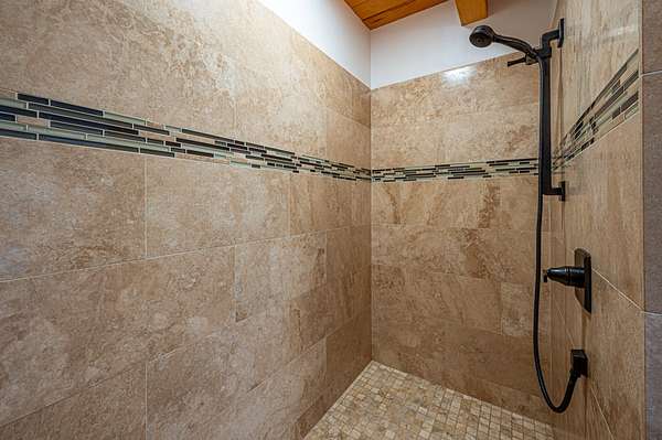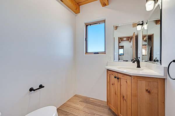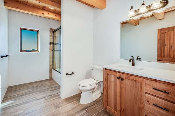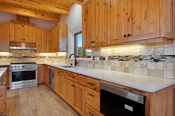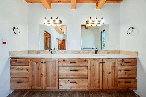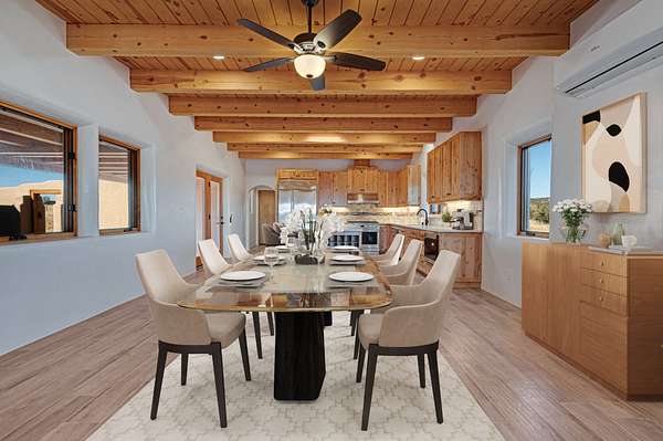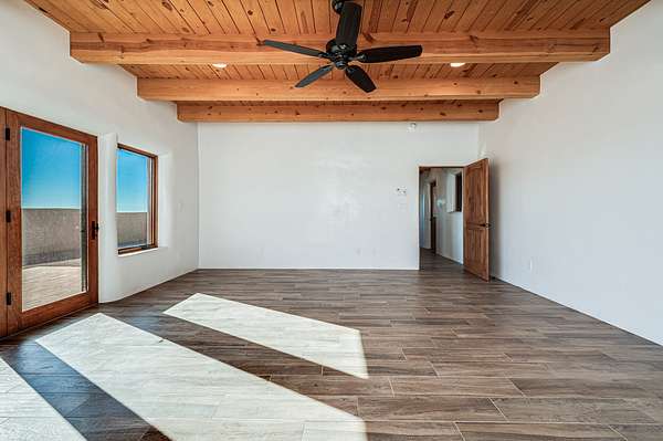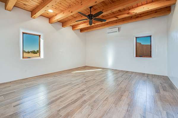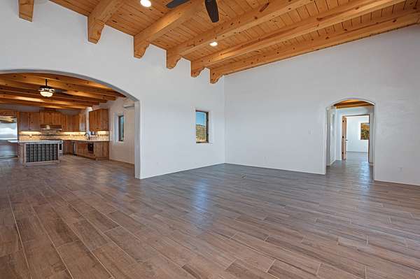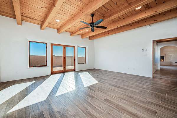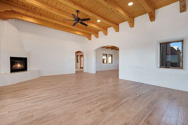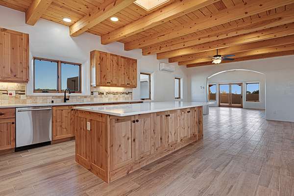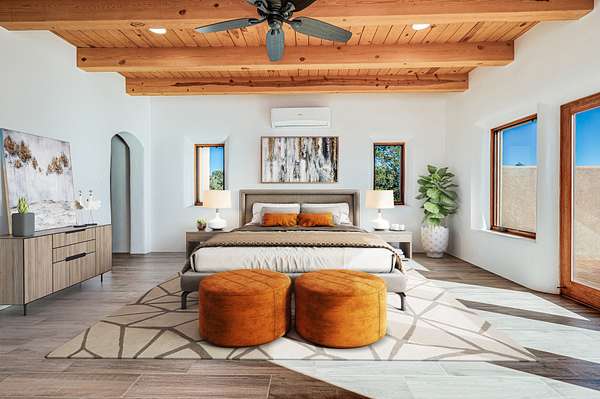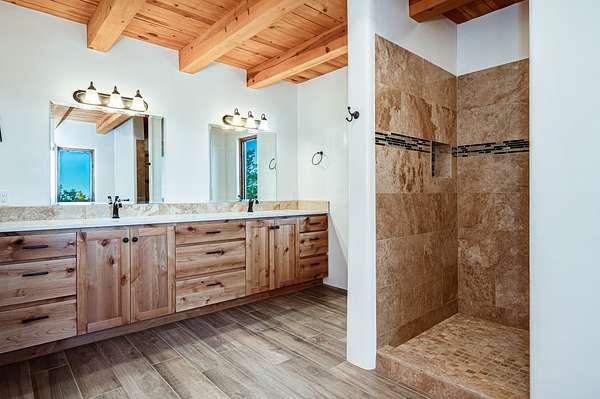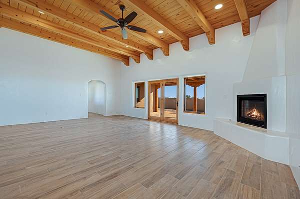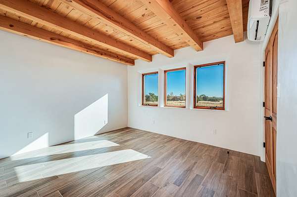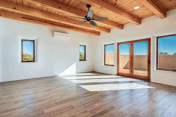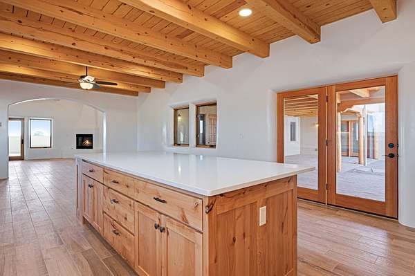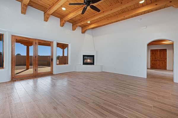 Stunning Adobe contemporary pueblo masterpiece by one of Santa Fe's premier adobe builders, Jeff Fagley of Shaylube Construction. Spec home never been lived in waiting for the first owner to enjoy. Open plan design with dramatic corbelled beam ceiling and Kiva fireplace in great room, tiled floors and gleaming thick smooth plastered walls throughout complement the classic elements of Santa Fe style. Spacious feel with high ceilings throughout, split 3 bedrooms plus office, large owners suite with private walled portal, 4 bathrooms separate guest suite. Natural gas radiant heat plus 5 mini splits for heating and cooling complementing the radiant in floor heating and passive solar design. A sunny chefs kitchen with butlers pantry and central island, large formal dining area opening to a wraparound portal for private outside dining and entertainment. A walled courtyard entry with wrap around portal also provides the access to both main home and guest quarters. There is a second privacy walled south courtyard with bricked portals accessed from living room and master suite also excellent for sunset mountain viewing. Roof drainage to 2 cisterns already installed underground catch the rainfall for landscaping. A large 3 car garage for lots of toys or hobbies, plenty of guest parking and lovely view with 7+acres to enjoy. Horses allowed. Enjoy access to local Eldorado area shopping, schools, senior center and library plus only minutes into Santa Fe.