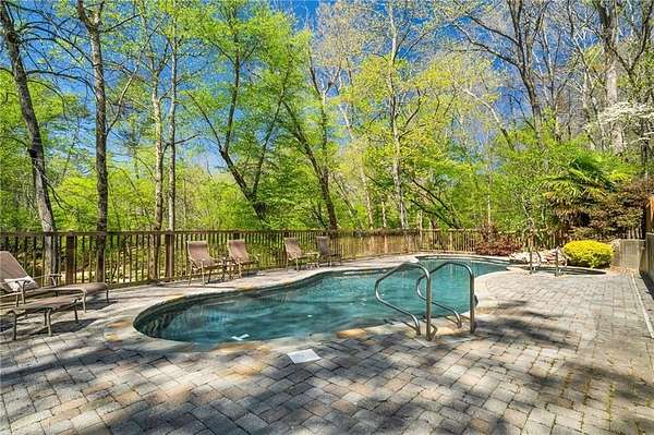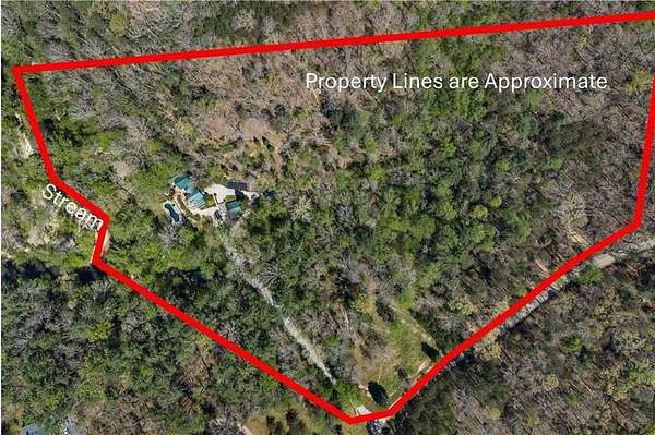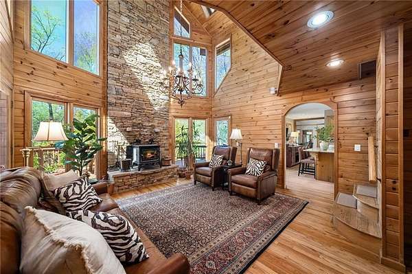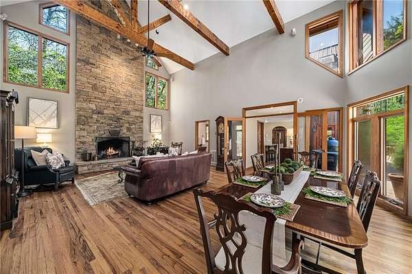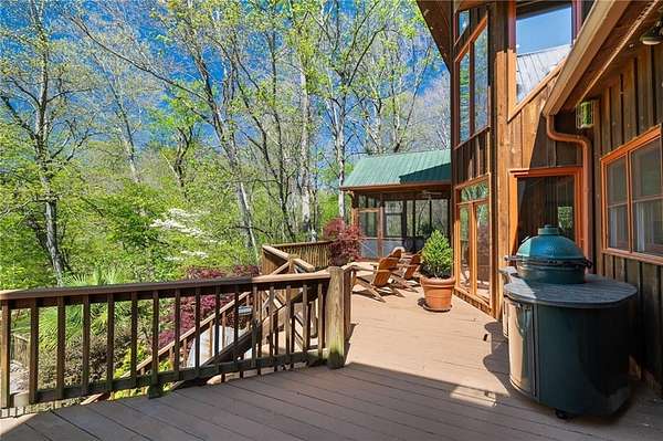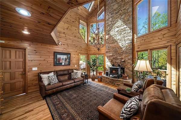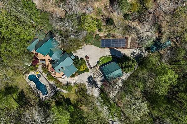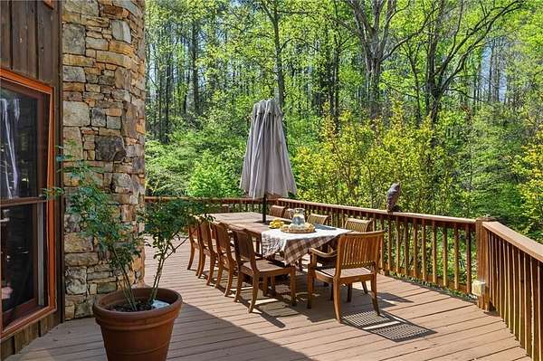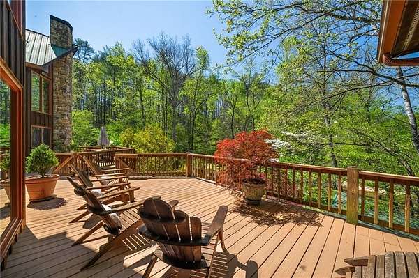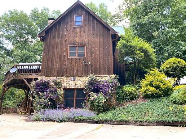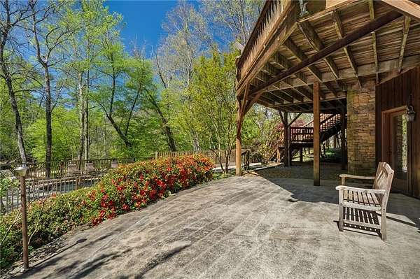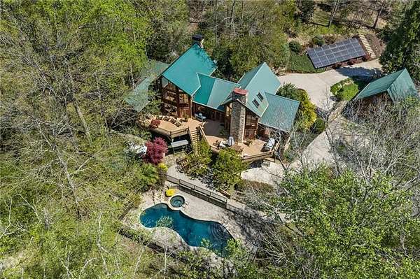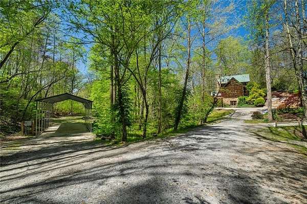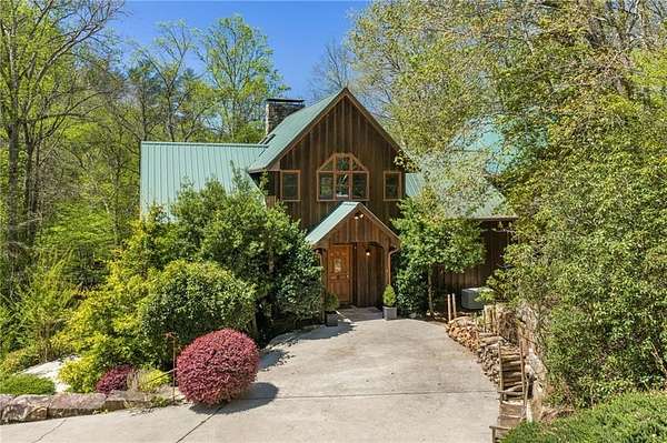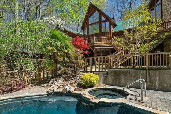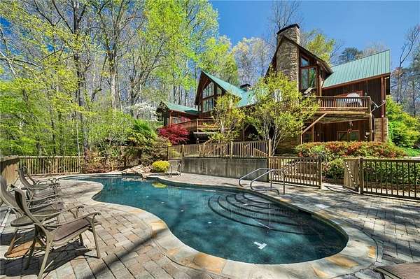 Enjoy the ease of peaceful estate living on more than 11 rolling acres, where this ski-lodge inspired home sits like a private retreat overlooking a walk-out pool and lovely stream view. Tucked away, yet well connected, this property lies just minutes from renowned vineyards and charming mountain towns, like Dahlonega and Helen, with quick access to GA-400 and only an hour away from the shops and restaurants of Milton and Alpharetta. Atlanta's international airport is an easy hour and a half away, as you return home along smooth roads and a paved curved driveway approaching this secluded estate. As you enter through the wood paneled foyer into the family room, the home immediately reveals its most captivating features - a two-story view of the wooded landscape, pool and river, warmed by a wood burning stove and walk out to an expansive wrap deck. To the left of the foyer sits a spacious main-level bedroom, perfect for guests, an office, or convenient single-level living. To the right is the chef's kitchen, featuring a Wolf range, upscale appliances, and striking granite countertops - also with walk out to the deck, where you may host large and small gatherings. As you walk through the kitchen, you are led to the grand gathering and dining space, anchored by a soaring stone masonry fireplace that rises dramatically toward the vaulted ceiling. Another two-story wall of windows brings the outdoors inside, offering a stunning backdrop for meals and celebrations. Completing the main level is a sunroom or artist's studio, where arched floor-to-ceiling windows fill the space with light. An adjoining breezy screened porch completes the main floor. Upstairs is the primary suite with private bath and large his and her closet. The lower terrace level offers a cozy gathering area with masonry fireplace, flanked by two generous bedrooms and a bath, and well-appointed laundry room with sink and abundant cabinetry for storage. Just steps away, the detached two-car garage includes a bonus space affectionately known as the "Gingerbread Housea charming over-garage air-conditioned apartment, suitable for guests or a retreat for the creative writer. Outside, stone walls and meandering pathways wind through curated native trees and flowering shrubs - a landscape intentionally designed to bloom with color and texture throughout the seasons. Gazing from the deck affords a beautiful view of a bend in the Tesnatee Creek where you may still pan for alluvial gold. The cleared, level lower yard between the pool and creek is ideal for badminton games or soccer practice. The 44 foot pool with spa is perfect for relaxing or swimming laps. Additional amenities include custom-covered RV parking with electrical service, and a second covered parking area with power. Irrigation and solar panels complete the exterior features. This property offers a rare opportunity for mornings to begin with coffee, birdsong, and the rush of a waterfall accompanying your remote workday or creative endeavors in the sunroom/studio, where landscape, woodlands, springs and creek align to create an environment of luxury and charm.