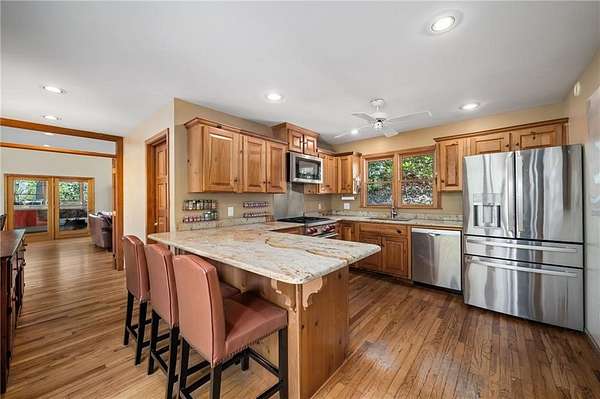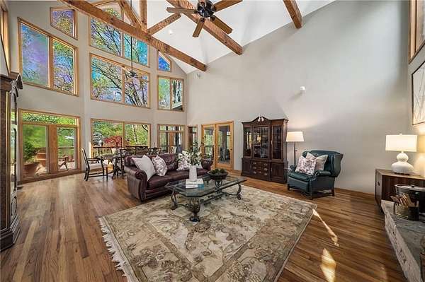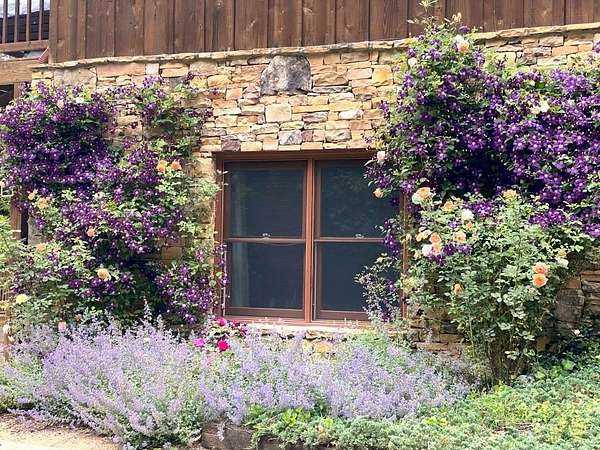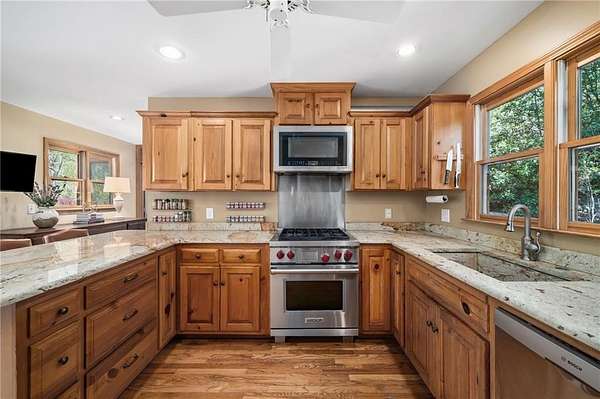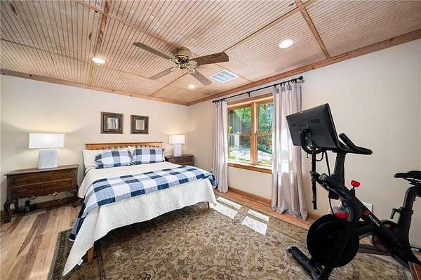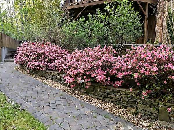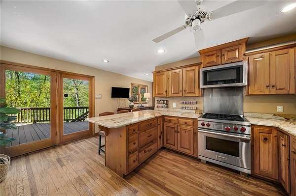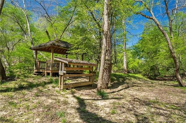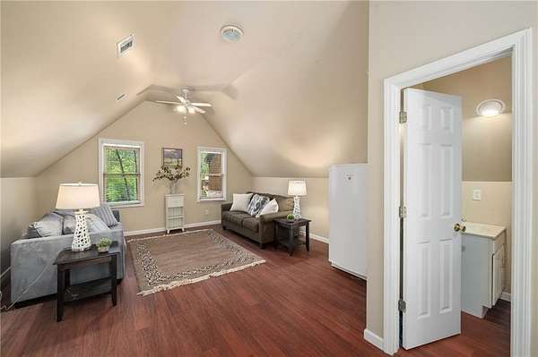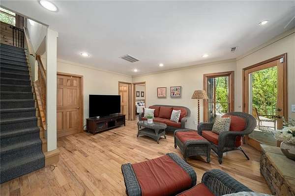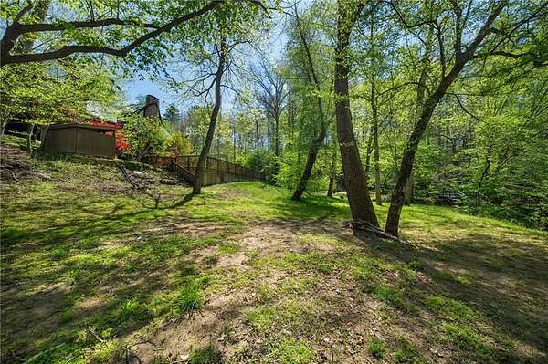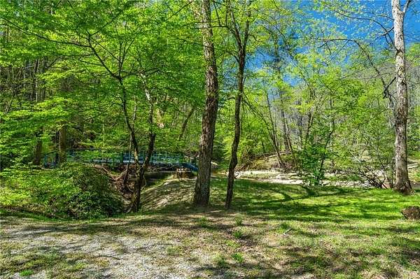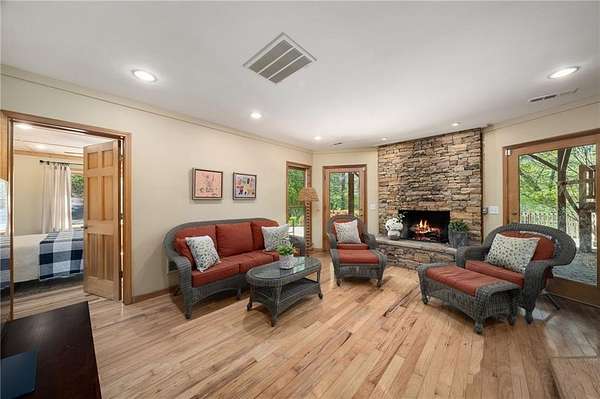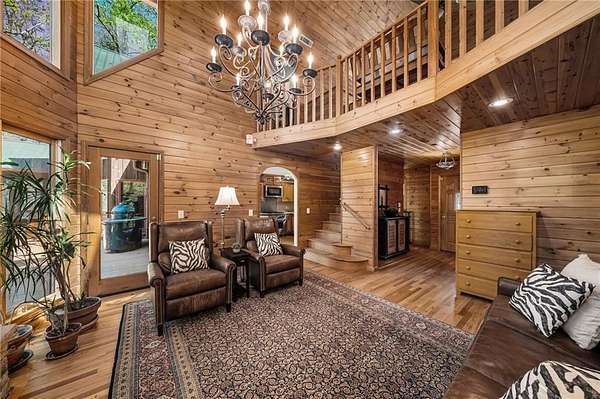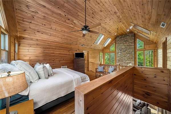 Enjoy the ease of peaceful estate living on more than 11 rolling acres, where this ski-lodge inspired home sits like a private retreat overlooking a walk-out pool and lovely stream view. Tucked away, yet well connected, this property lies just minutes from renowned vineyards and charming mountain towns, like Dahlonega and Helen, with quick access to GA-400 and only an hour away from the shops and restaurants of Milton and Alpharetta. Atlanta's international airport is an easy hour and a half away, as you return home along smooth roads and a paved curved driveway approaching this secluded estate. As you enter through the wood paneled foyer into the family room, the home immediately reveals its most captivating features - a two-story view of the wooded landscape, pool and river, warmed by a wood burning stove and walk out to an expansive wrap deck. To the left of the foyer sits a spacious main-level bedroom, perfect for guests, an office, or convenient single-level living. To the right is the chef's kitchen, featuring a Wolf range, upscale appliances, and striking granite countertops - also with walk out to the deck, where you may host large and small gatherings. As you walk through the kitchen, you are led to the grand gathering and dining space, anchored by a soaring stone masonry fireplace that rises dramatically toward the vaulted ceiling. Another two-story wall of windows brings the outdoors inside, offering a stunning backdrop for meals and celebrations. Completing the main level is a sunroom or artist's studio, where arched floor-to-ceiling windows fill the space with light. An adjoining breezy screened porch completes the main floor. Upstairs is the primary suite with private bath and large his and her closet. The lower terrace level offers a cozy gathering area with masonry fireplace, flanked by two generous bedrooms and a bath, and well-appointed laundry room with sink and abundant cabinetry for storage. Just steps away, the detached two-car garage includes a bonus space affectionately known as the "Gingerbread Housea charming over-garage air-conditioned apartment, suitable for guests or a retreat for the creative writer. Outside, stone walls and meandering pathways wind through curated native trees and flowering shrubs - a landscape intentionally designed to bloom with color and texture throughout the seasons. Gazing from the deck affords a beautiful view of a bend in the Tesnatee Creek where you may still pan for alluvial gold. The cleared, level lower yard between the pool and creek is ideal for badminton games or soccer practice. The 44 foot pool with spa is perfect for relaxing or swimming laps. Additional amenities include custom-covered RV parking with electrical service, and a second covered parking area with power. Irrigation and solar panels complete the exterior features. This property offers a rare opportunity for mornings to begin with coffee, birdsong, and the rush of a waterfall accompanying your remote workday or creative endeavors in the sunroom/studio, where landscape, woodlands, springs and creek align to create an environment of luxury and charm.