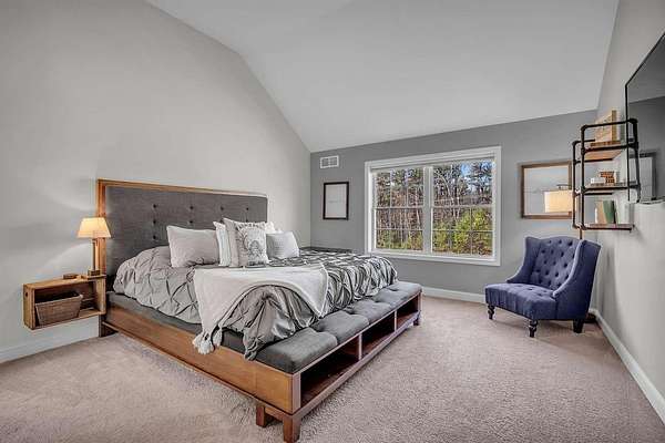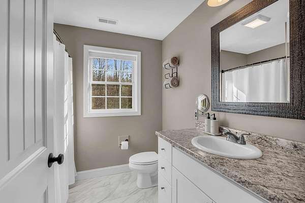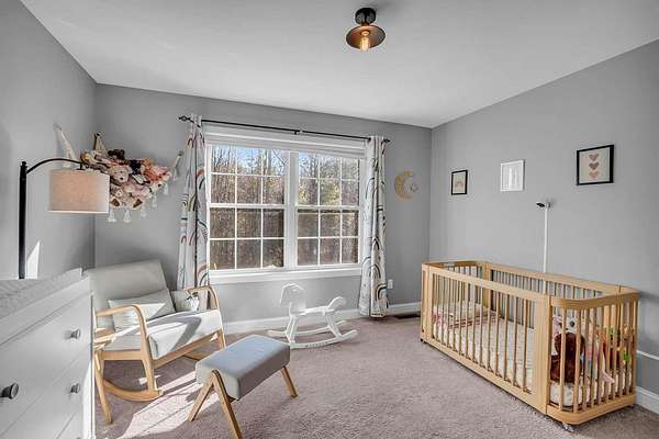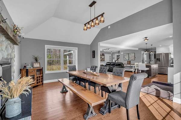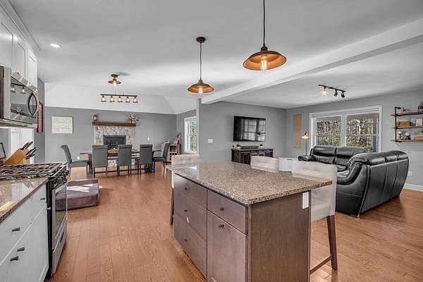 Built in 2017 and thoughtfully upgraded, this turnkey Colonial offers a rare blend of privacy, flexible living space, and income potential on approximately 5.6 acres in Weare. The main living level features an open-concept layout designed for everyday living and entertaining, highlighted by a sun-filled dining area with a gas fireplace, natural stone surround, and granite hearth. The kitchen offers granite countertops, a center island, ample cabinetry, and a walk-in pantry. Upstairs, the primary suite includes vaulted ceilings, a spacious walk-in closet, and a private bath. Additional bedrooms are generously sized and well-suited for guest or office use. The fully finished lower level adds exceptional versatility with a dedicated studio or office, theater area, and built-in bar, ideal for remote work or entertaining. Set on approximately 5.6 acres, the property features a mix of cleared land and wooded surroundings, framed by a natural stone wall along three sides. A standout feature is the 30' x 30' barn with lean-to and its own gated driveway, offering flexibility for hobbies, workspace, storage, or supplemental rental use. Additional highlights include an EV charger in the attached garage, irrigation system, hardwood floors, energy-efficient systems, covered porch, established landscaping, and maple trees ready for tapping. Now vacant and move-in ready, this property delivers privacy, versatility, and modern living in a desirable New Hampshire setting.