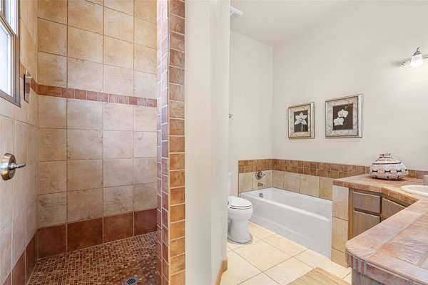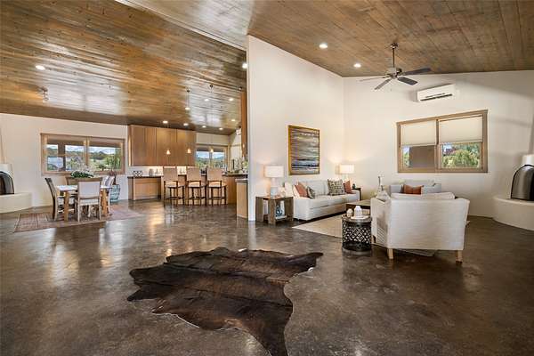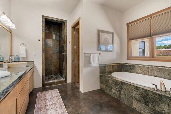 Located in Santa Fe's sought-after Tano Road area, this Northern New Mexico-style pitched roof abode is sited beautifully with huge sunset views to the west and the spectacular Jemez Mountains. Built in 2006, the single-level main residence offers 2,689 sq. ft. with three bedrooms, two and a half baths, and 2 fireplaces. The guest casita offers its own garage, 1659 sq ft, 2 bedrooms, 2 bathrooms, and 2 fireplaces blending comfort with authentic Santa Fe design. Interiors feature polished concrete floors, and deep portals in the front and back frame sweeping mountain vistas, creating a serene canvas for indoor-outdoor living. A rare multi-bay 3+ cars garage and workshop invites car collectors, woodworkers, or artists needing a large studio/workshop to create and house with ease. Just minutes from the Plaza and Canyon Road, and only 1.5 miles from the La Tierra Trails, this property combines artistry, privacy, and timeless character. Be sure to take the virtual tour and book your private showing now!