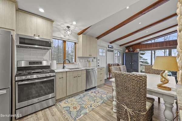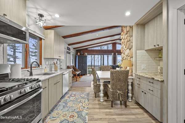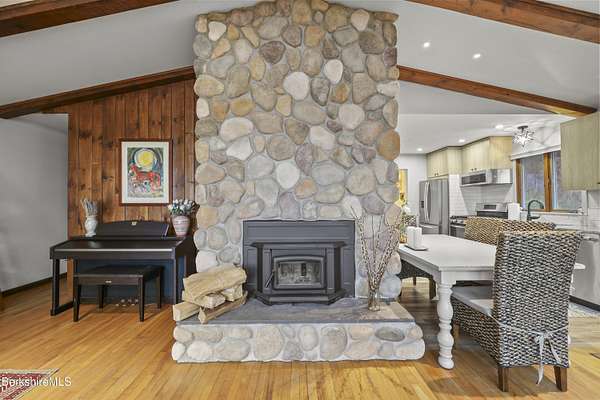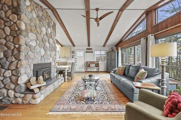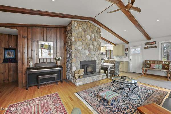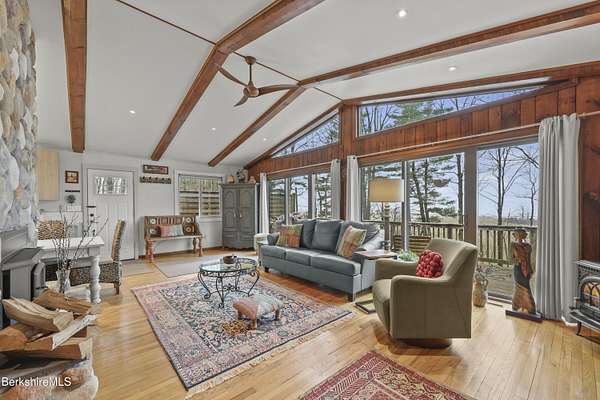 Embrace the quintessential Berkshires lifestyle in this beautifully appointed home, where expansive views from the front deck and an open-concept living area invite you to relax and unwind. For those chilly evenings, cozy up by the wood-burning fireplace, newly enhanced with beautiful natural river rock. For instant warmth, a freestanding gas stove is available at the click of a switch when needed. Designed for effortless one-floor living, the main level features the updated kitchen, dining area plus a thoughtfully placed bedroom and full bath tucked quietly at the rear. The lower walkout level offers excellent separation with two additional bedrooms and a second full bath. Located directly across from the protected Ice House Hill Farm Trust and ... ...Richmond Land Trust behind, you'll enjoy preserved views and a lasting sense of privacy. The renowned music venue Tanglewood and Kripalu Center for Yoga & Health - all the cultural treasures of Lenox, Stockbridge, and Pittsfield - are just a short, scenic drive away.