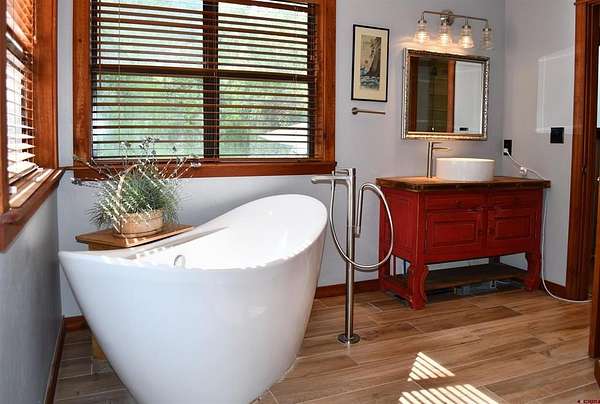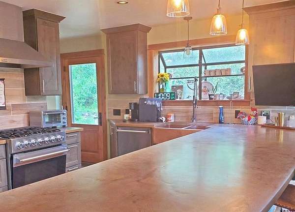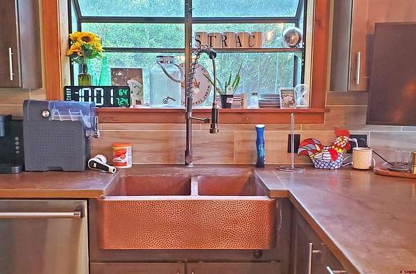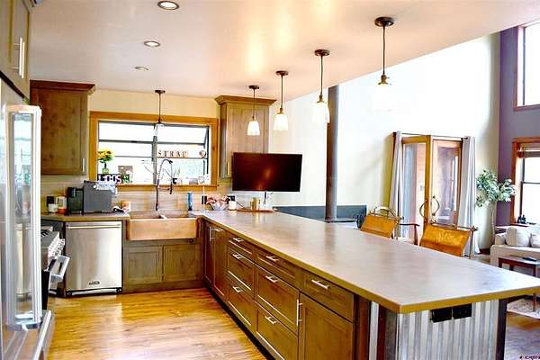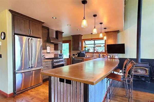 Karen R Overington, Keller Williams Realty Southwest Associates, LLC, H: 970-375-3246, koverington@kw.com, http://www.durangorealestateteam.com: Thoughtfully designed mountain home with expansive views over Rico and the San Juans. The floorplan is straightforward and flexible: use it as a primary residence, second home, or pursue short-term rental income (buyer to verify town STR rules). A lower-level bedroom with a full bath can be locked off for guests, a caretaker, or rental. The main level has a vaulted great room with a wood stove and large windows that frame town-and-mountain sightlines. The kitchen is built to work: stainless appliances including a new six-burner range/oven, roughly 17 feet of concrete counter, bar seating, and direct access to a patio for grilling and cool evening air. The great room opens to a brand-new deck with big views of Rico and the surrounding mountains. The primary suite is on the main living level for no-stairs convenience--full bath with soaking tub and oversized shower, plus a walk-in closet sized for real storage. An upstairs loft offers a second living area--media, office, or play space. A guest suite on this floor has its own bath, sitting room, and access to a rear deck. The lower level offers a lock-off/ non-confirming third bedroom with an adjacent full bath; it could be configured as a private guest room, rental, or caretaker's residence--the wooded setting, with mountain exposure and a seasonal spring on the property. The location is the value add: real small-town services and trail/river access, with Telluride's lifts, festivals, and dining about 45 minutes up CO-145. Regional airports at Montrose and Cortez expand travel options; high-speed internet supports remote work.